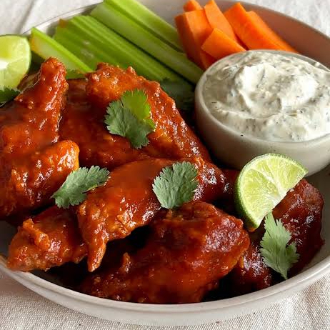 Alitas en salsa macha picosita, acompañadas de aderezo ranch y bastones de zanahoria y apio