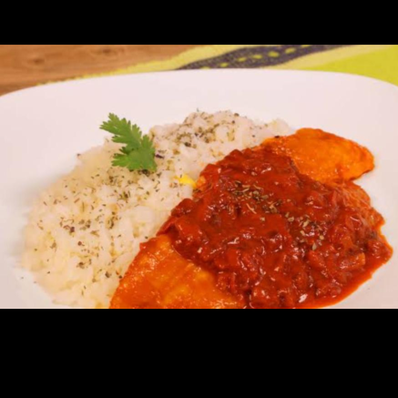 Filete de pescado bañado en salsa a la diabla acompañados de papas fritas y ensalada de lechuga