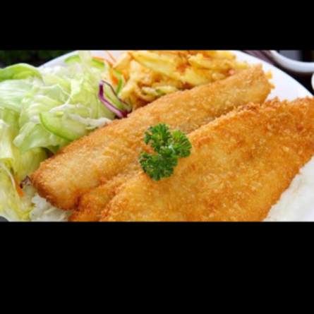 Filete de pescado empanizado acompañado de papas a la francesa y ensalada de lechuga