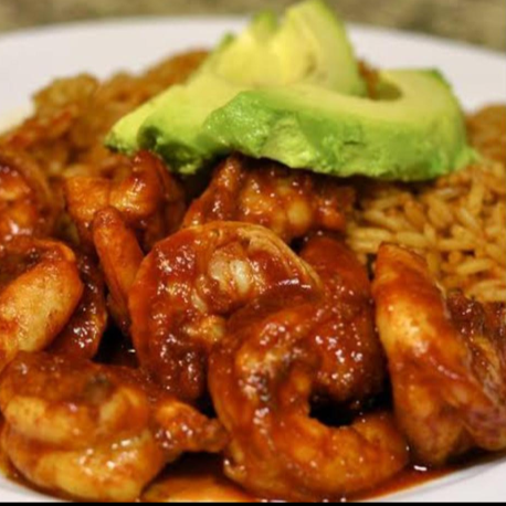 Camarones en salsa a la diabla acompañados de papas fritas y ensalada de lechuga