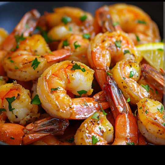 Camarones guisados mantequilla con trocitos de chile de árbol acompañados de papas fritas y ensalada
