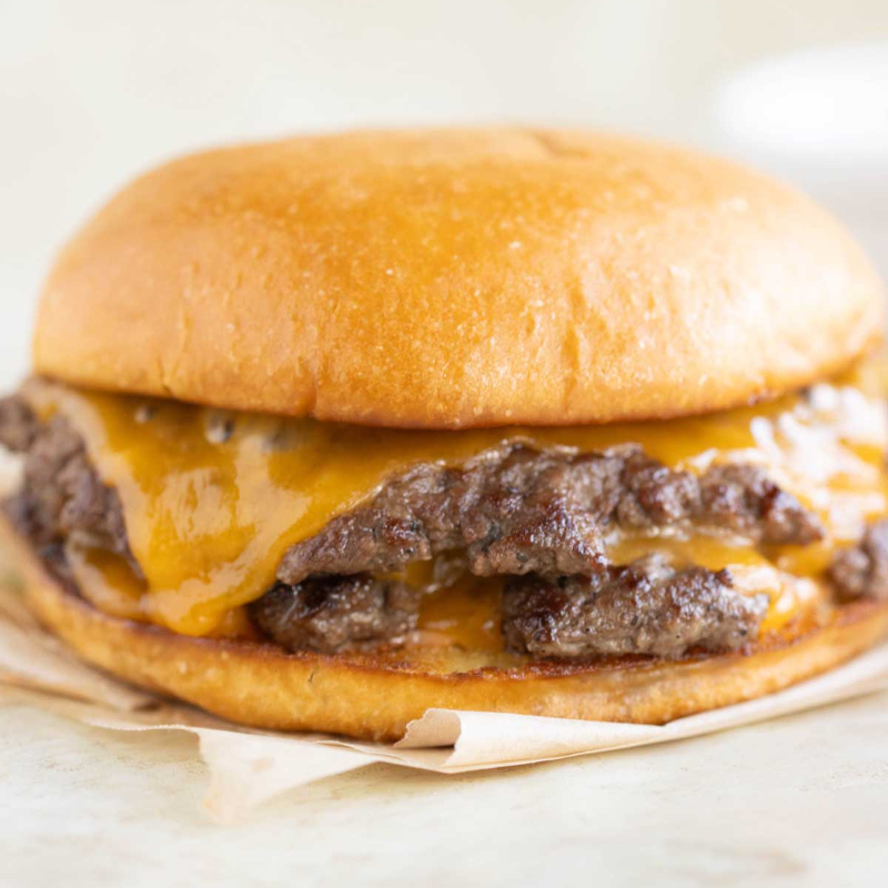 Pan brioche , doble carne 80-20 de res , doble queso americano,aderezo , con una cama de salsa de queso y una porción de papas a la francesa