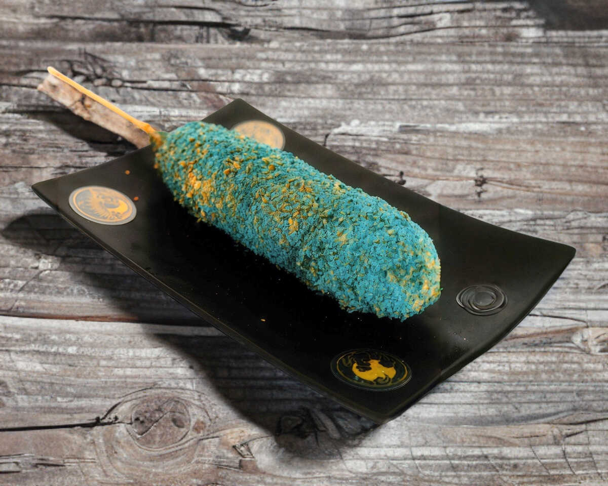 Salchicha jumbo envuelta en una masa crujiente con el intenso sabor del Flamin’ Hot Azul 🌌🔥 Una explosión de picante y color en cada mordida.
