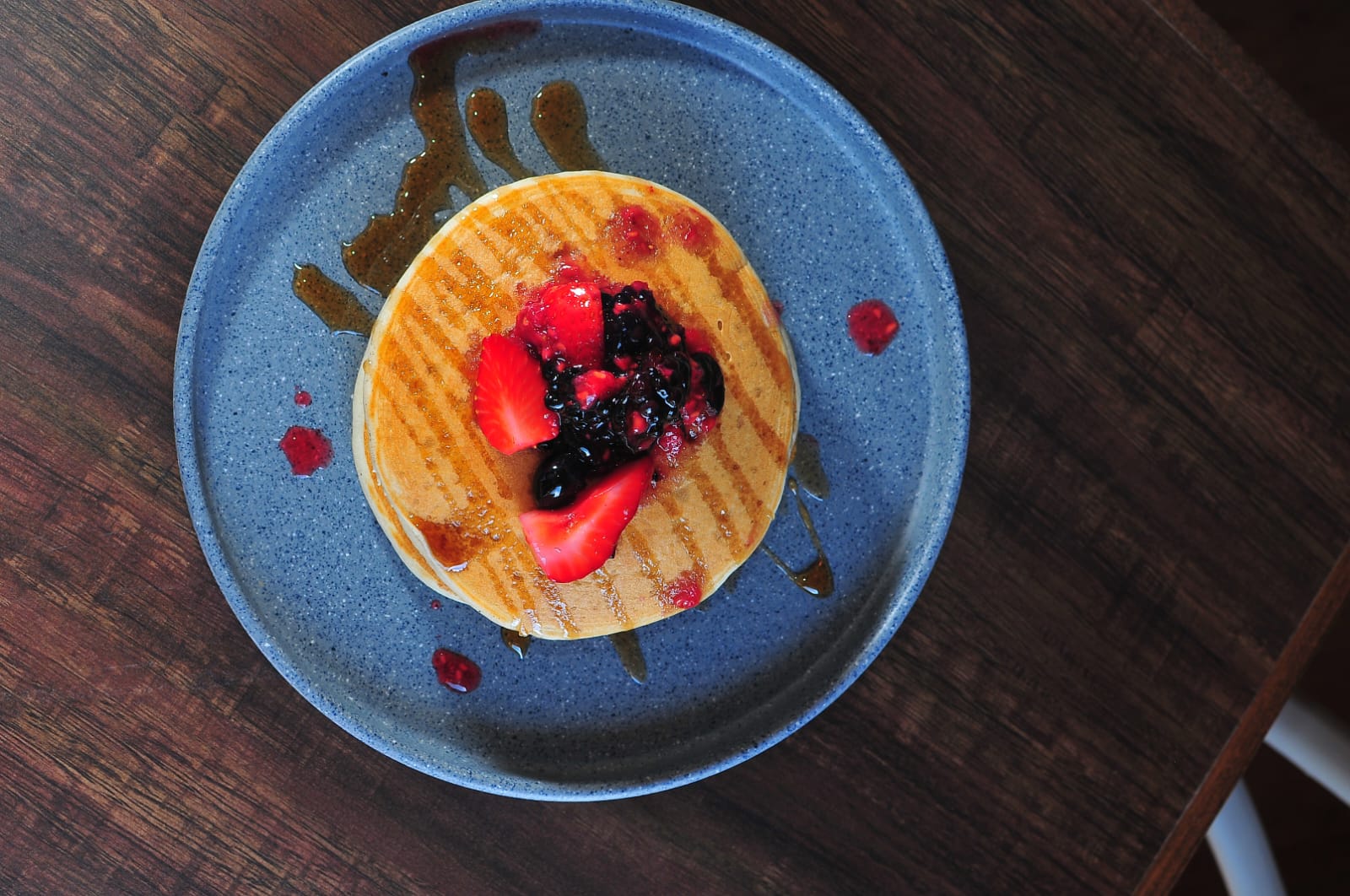 Servidos con compota de frutos rojos y miel maple, decorados con azucar glass