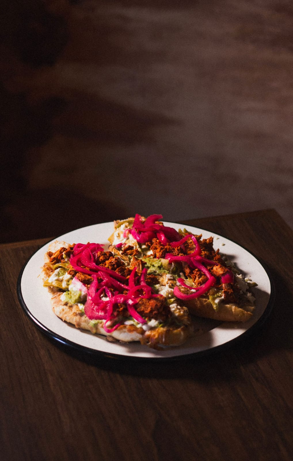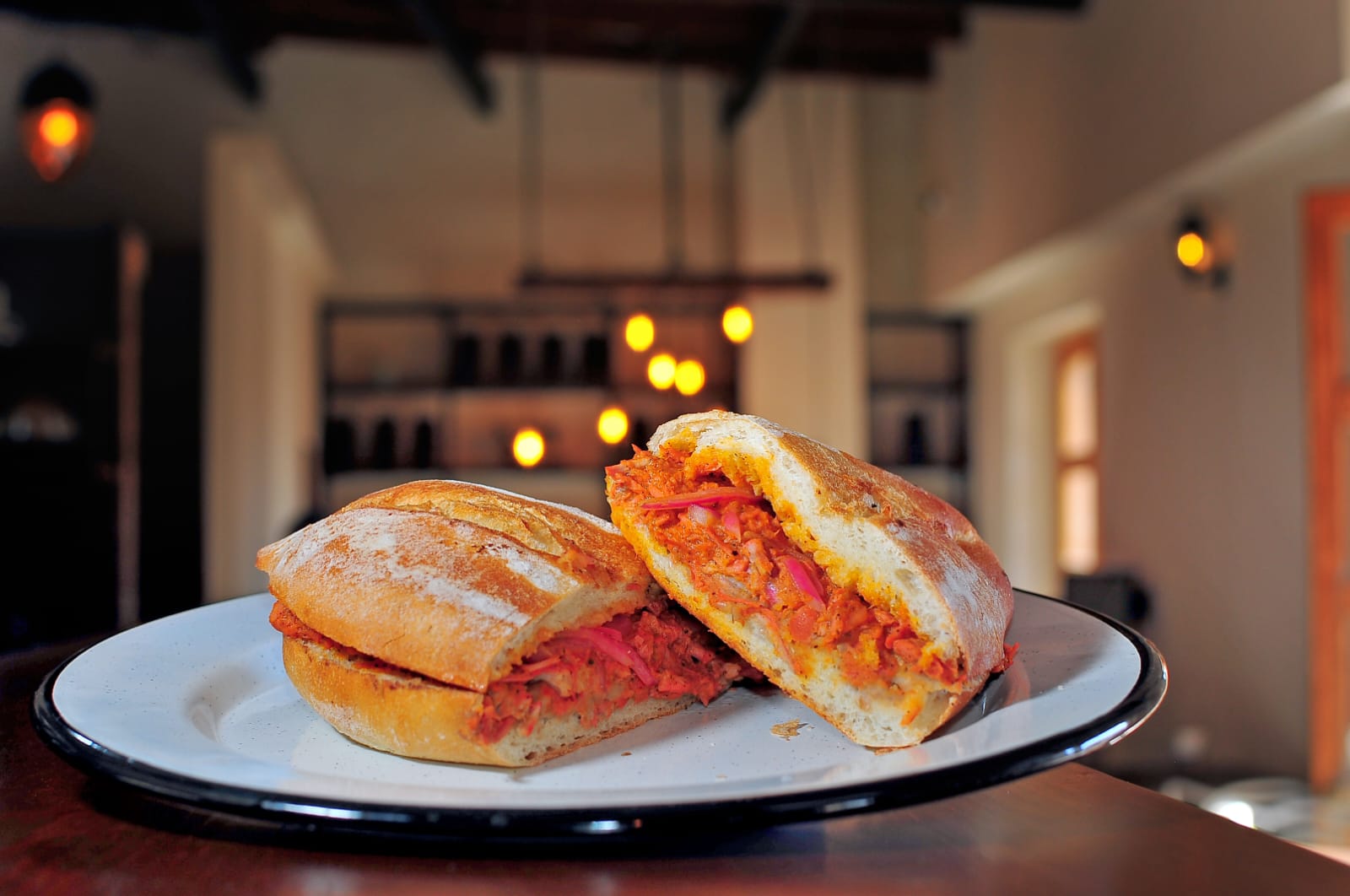 Pan lagunero, frijoles, cochinita y cebolla morada encurtida.