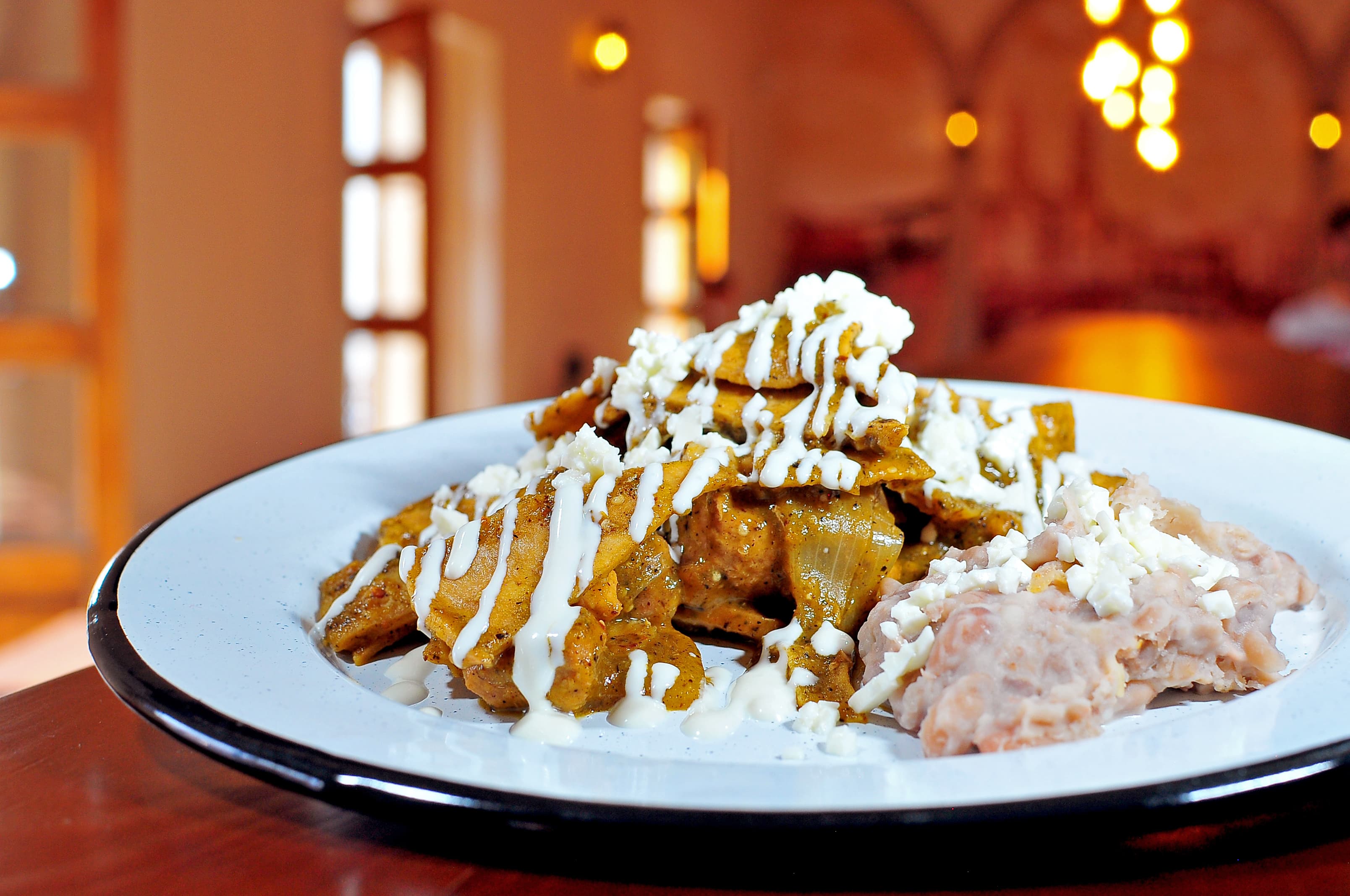 Totopos bañados en salsa verde tatemada, acompañados de frijoles y servidos con queso, crema y cebolla.