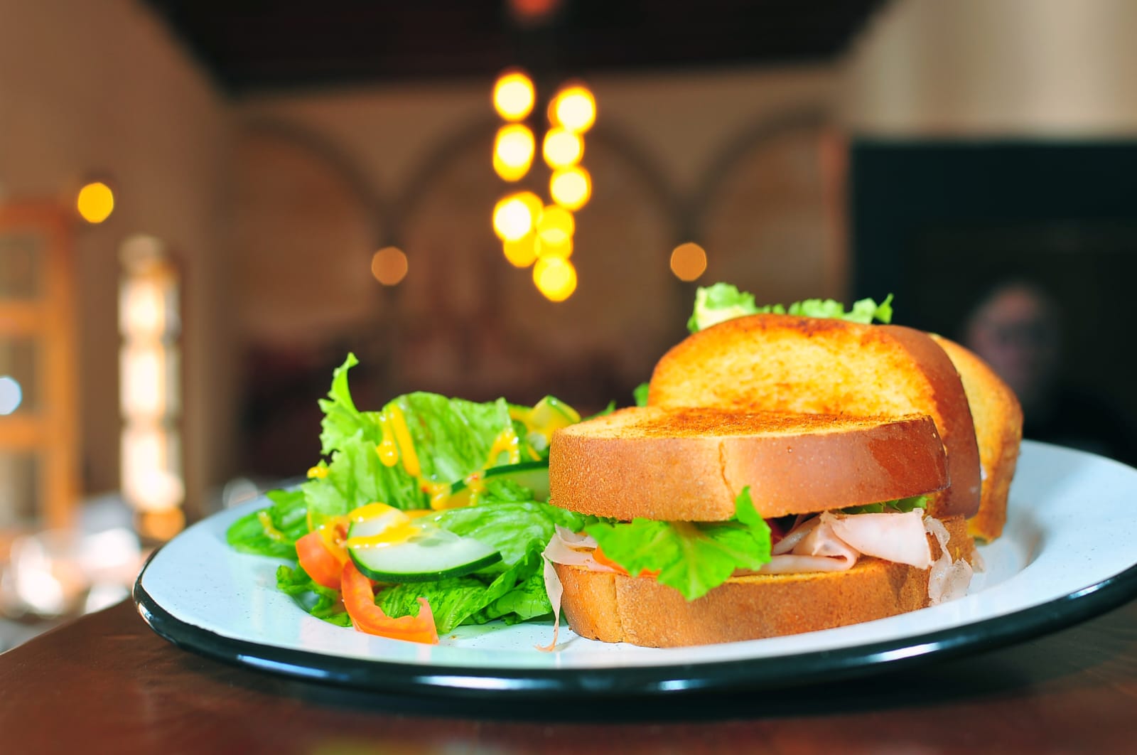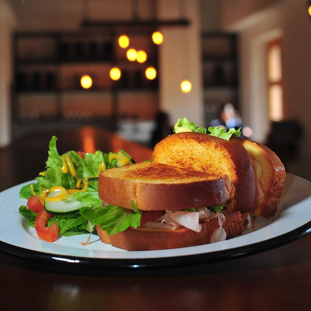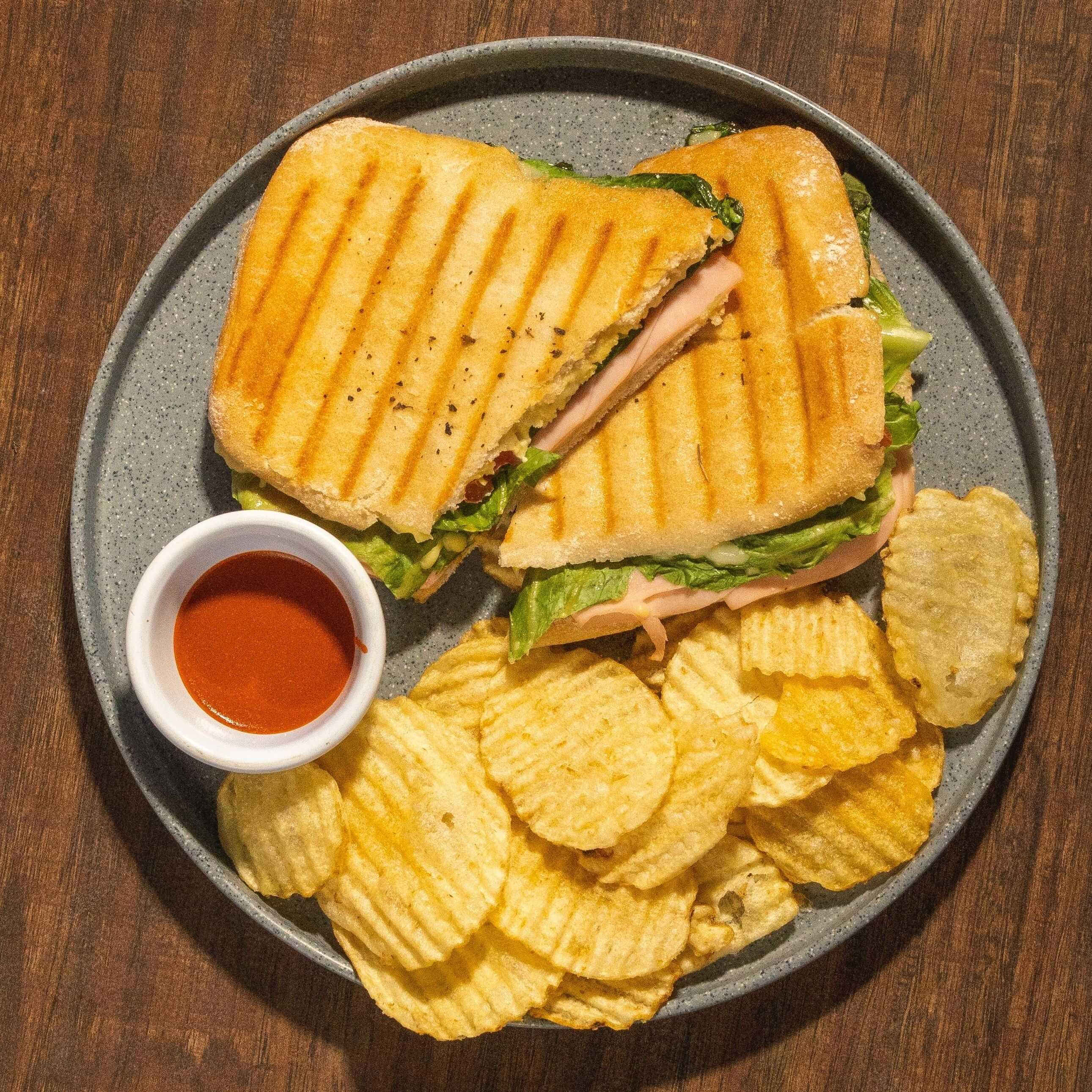 Pan brioche, pechuga de pavo, queso chihuahua, lechuga, jitomate y aguacate. Acompañado de ensalda de lechuga, jitomate, pepino y aderezo, servido con mayonesa natural chipotle o jalapeño.