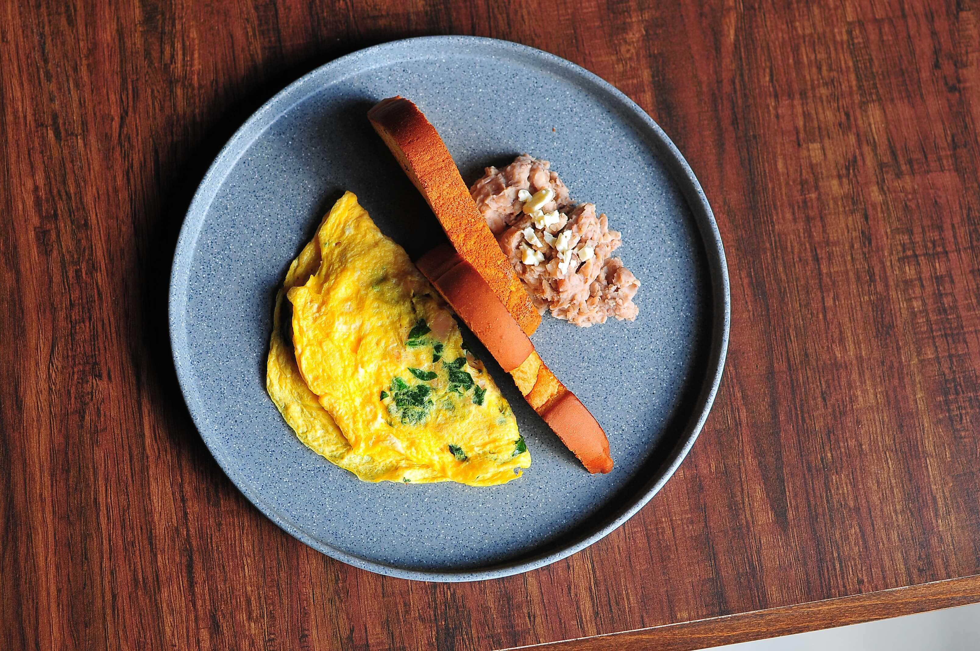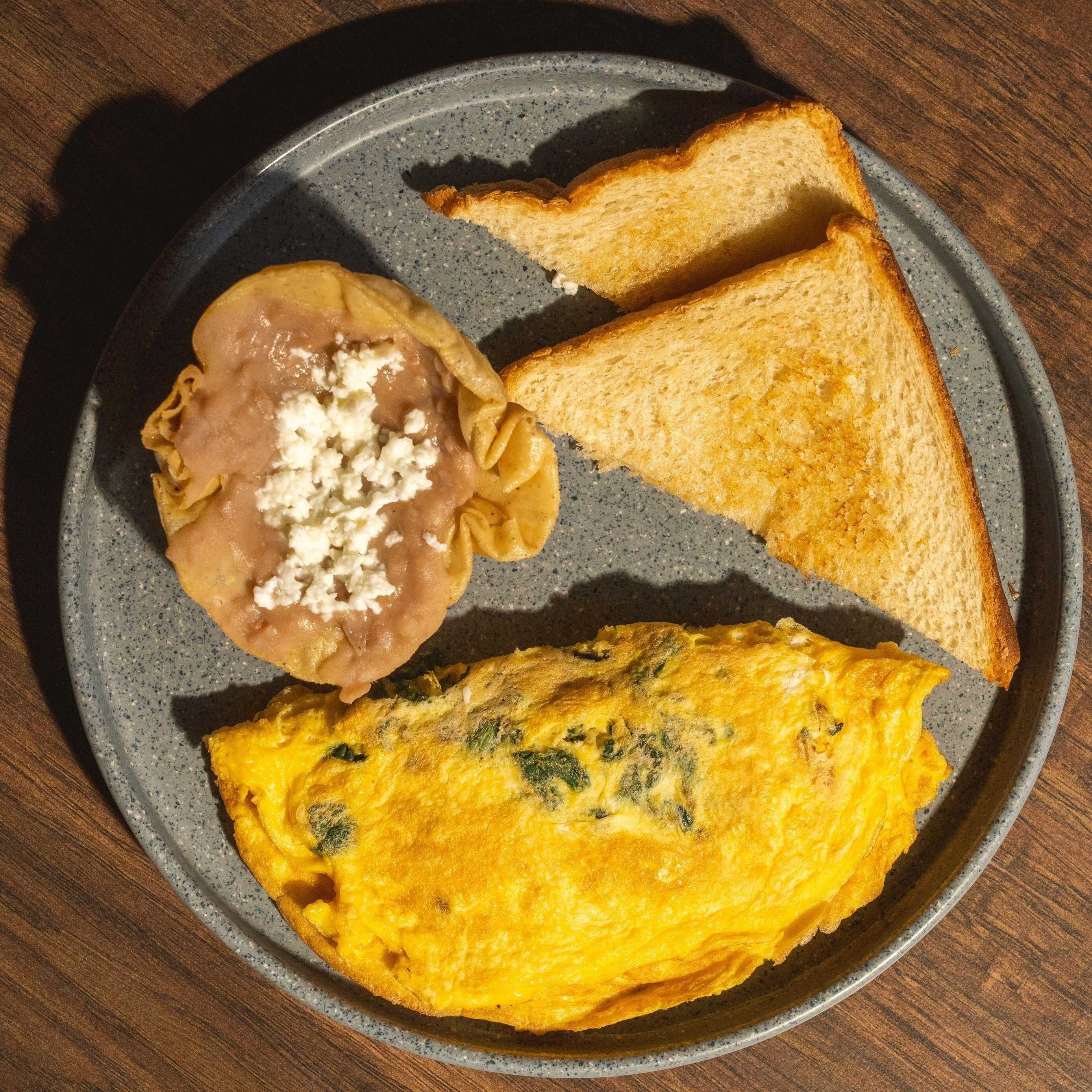 Omelette de queso de cabra y espinaca, acompañado de frijoles y pan tostado.