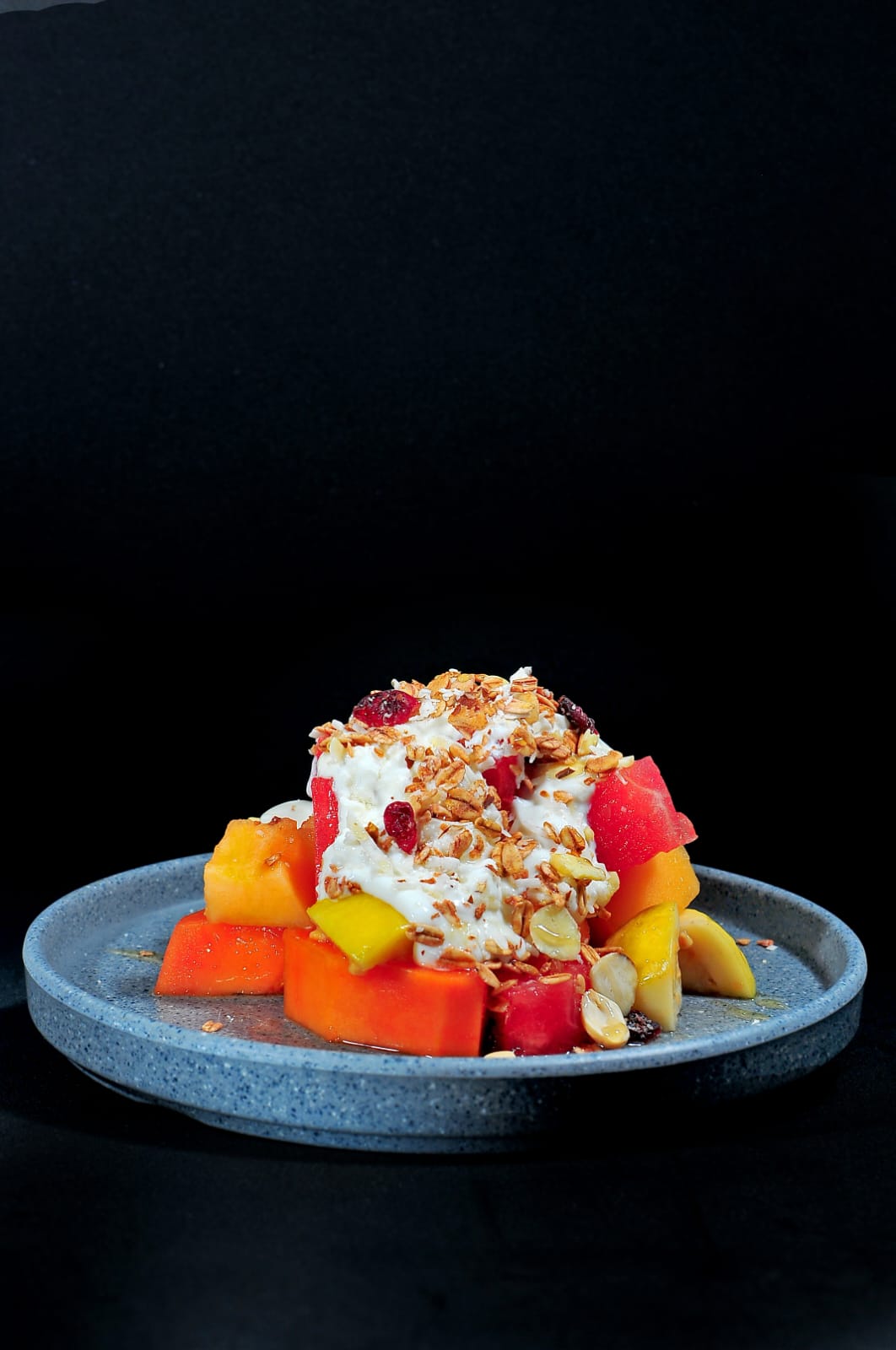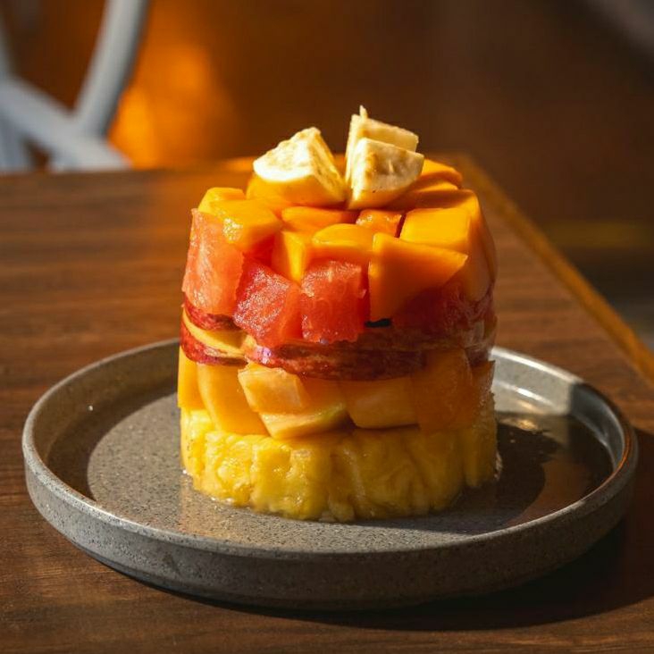 Fruta de temporada servida con yogurt, granola, miel y queso cottage.