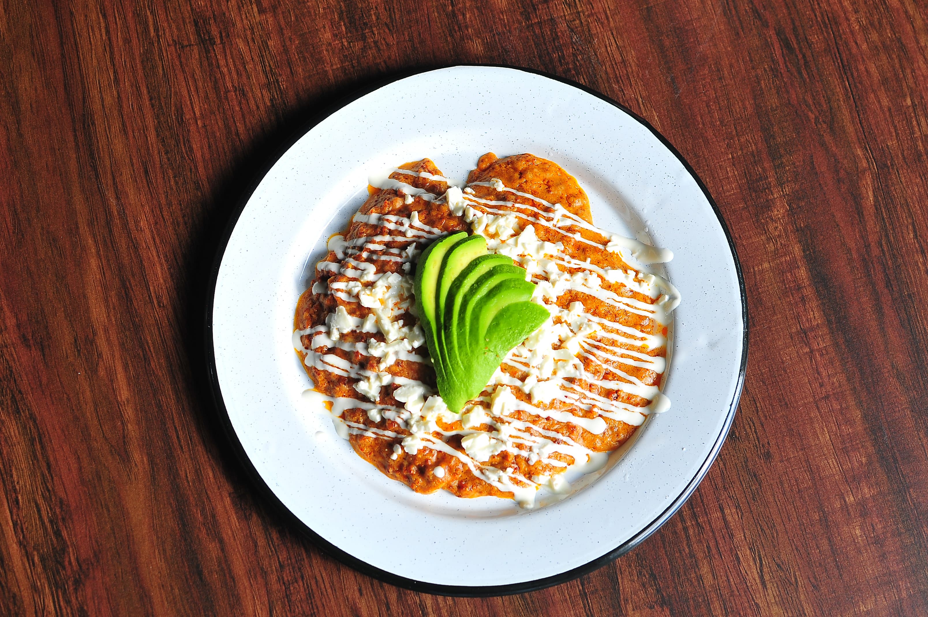 3 pzas Salsa de frijol guisada con chorizo, servidas con aguacate.
