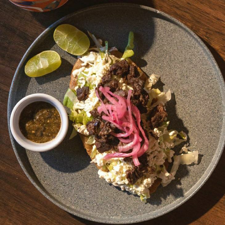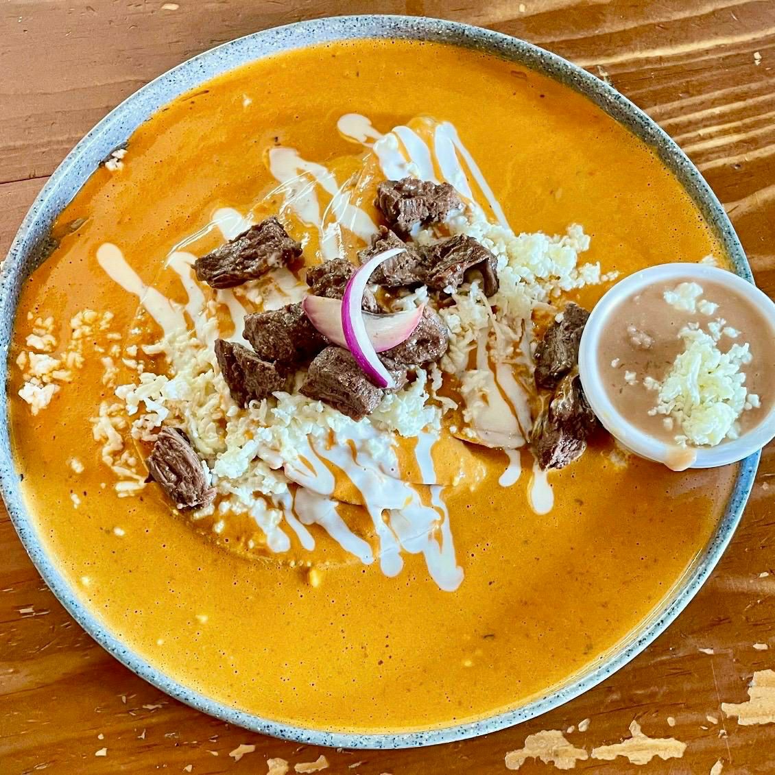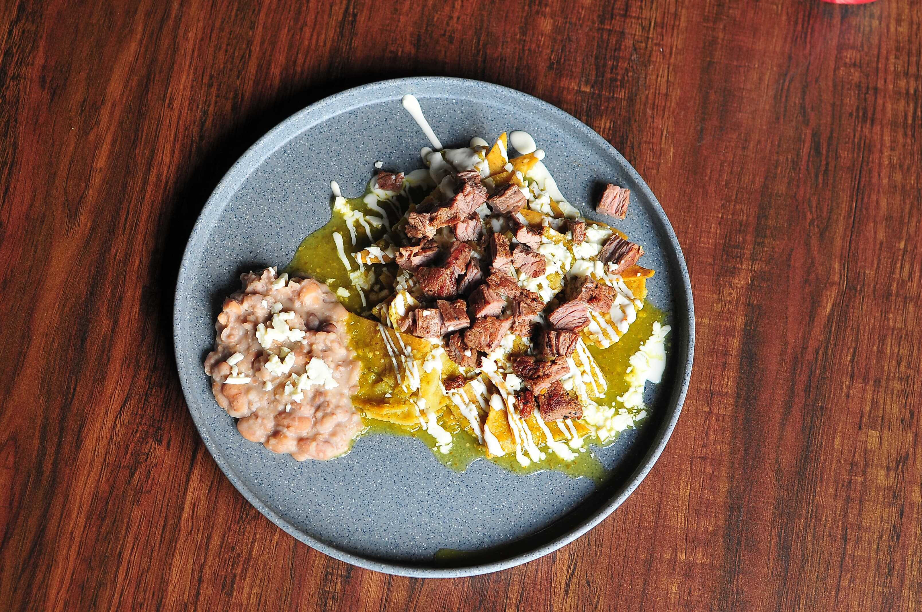 Totopos bañados en salsa a elegir con arrachera, acompañados de frijoles y servidos con queso, crema y cebolla.