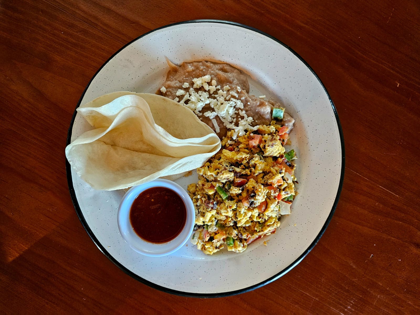 Omelette de pavo, acompañado de frijoles y pan tostado.