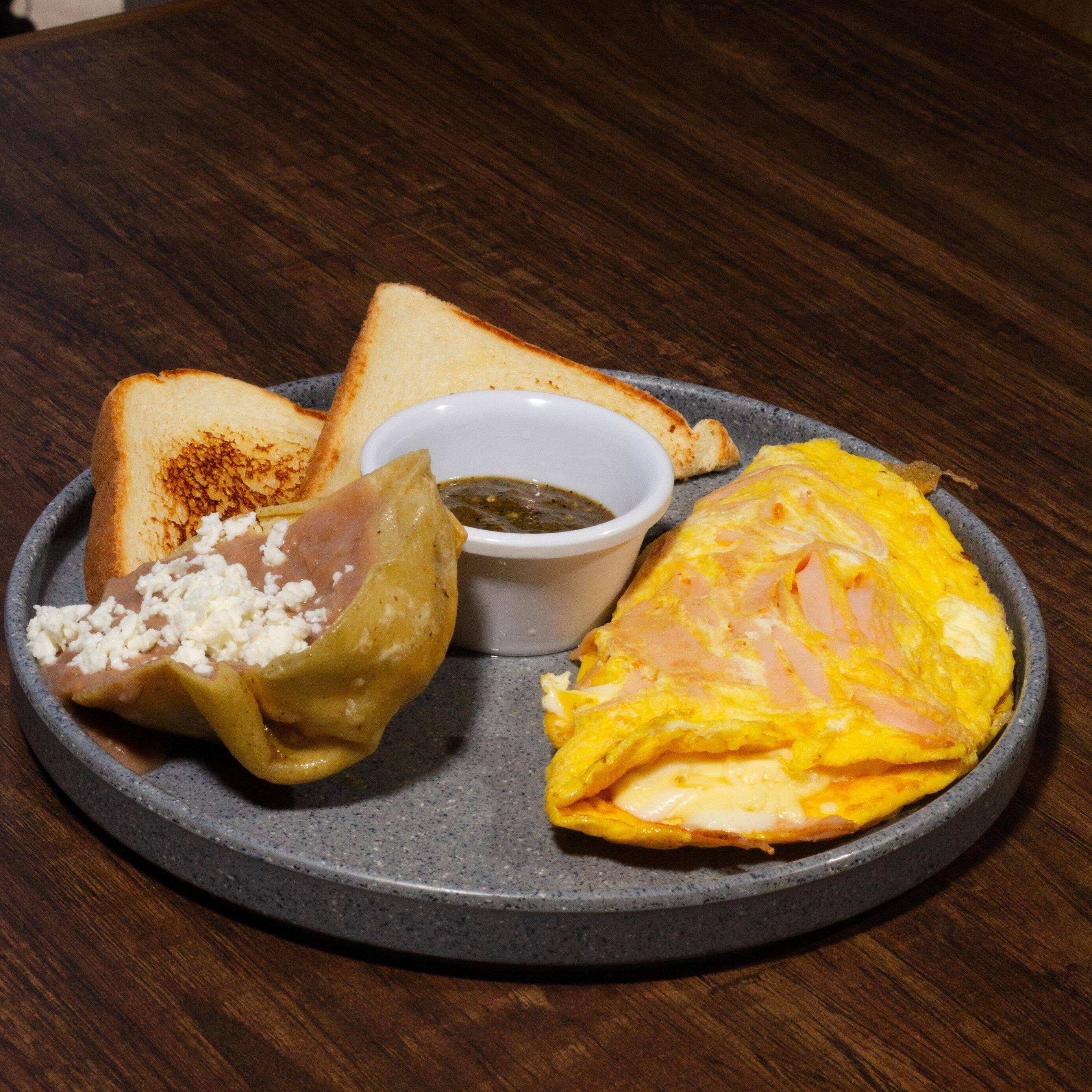 Omelette con requesón, acompañados de frijoles y pan tostado.