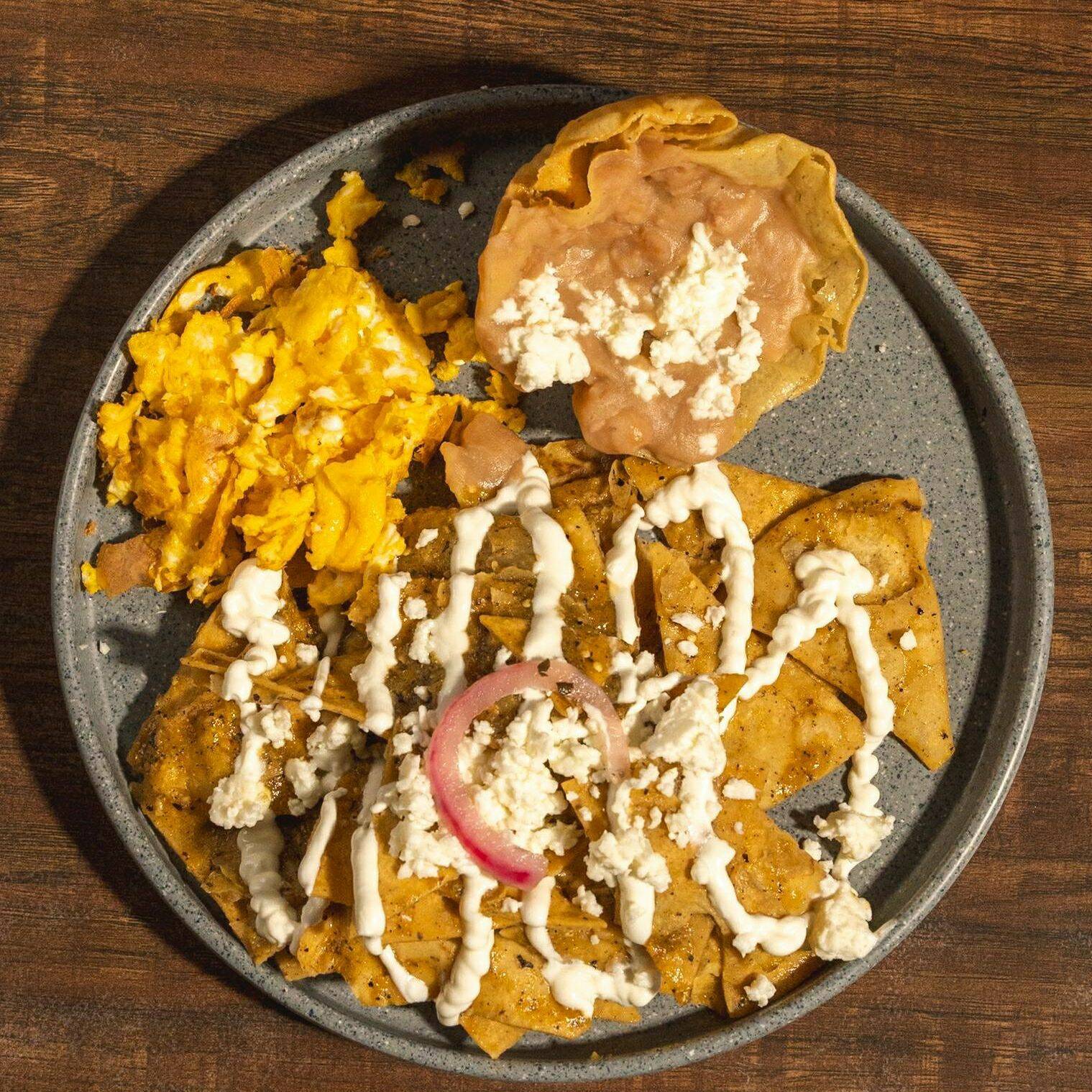 Totopos bañados en salsa verde tatemada con huevo revuelto, acompañados de frijoles y servidos con queso, crema y cebolla.