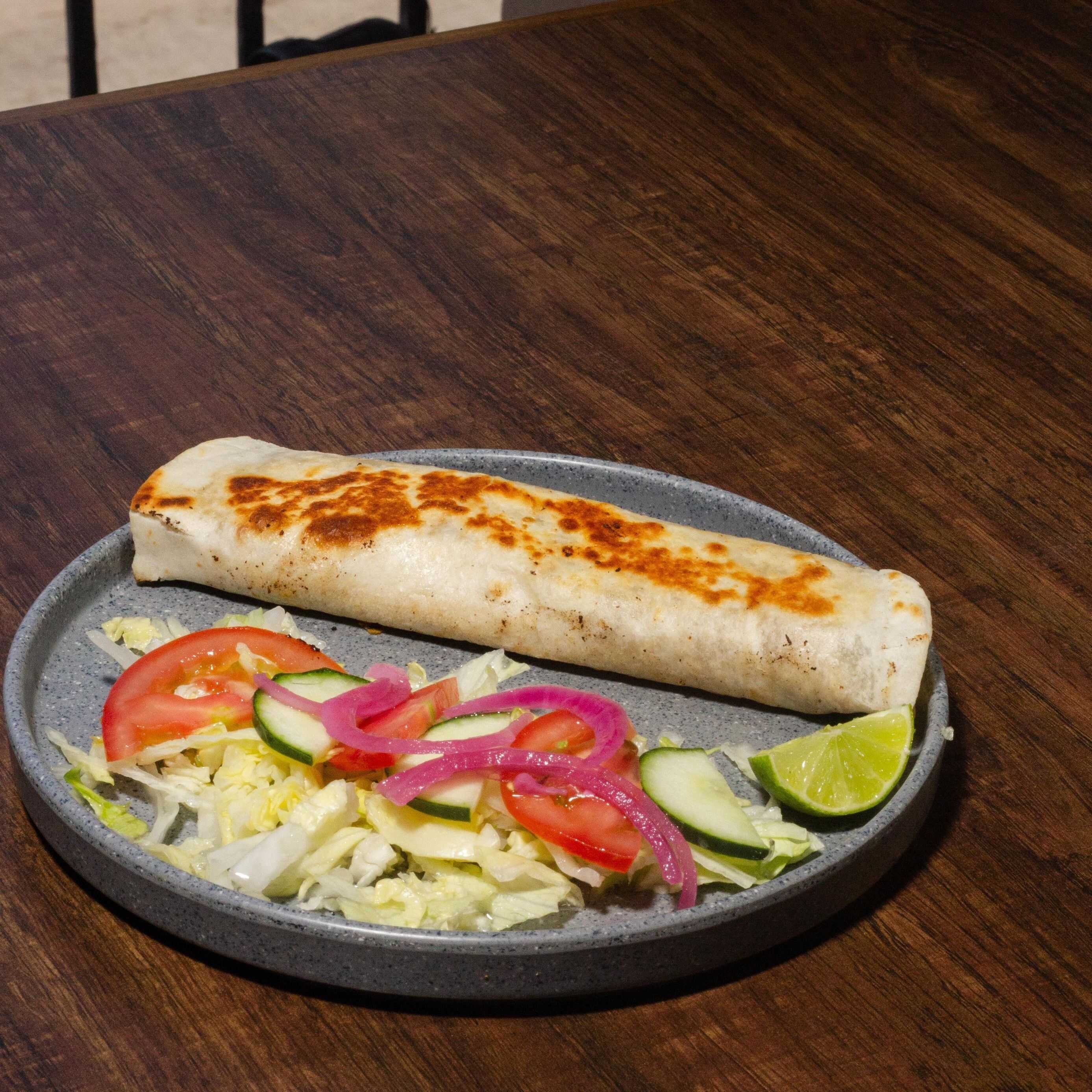 Un burrito con guiso a elegir, acompañado de ensalada