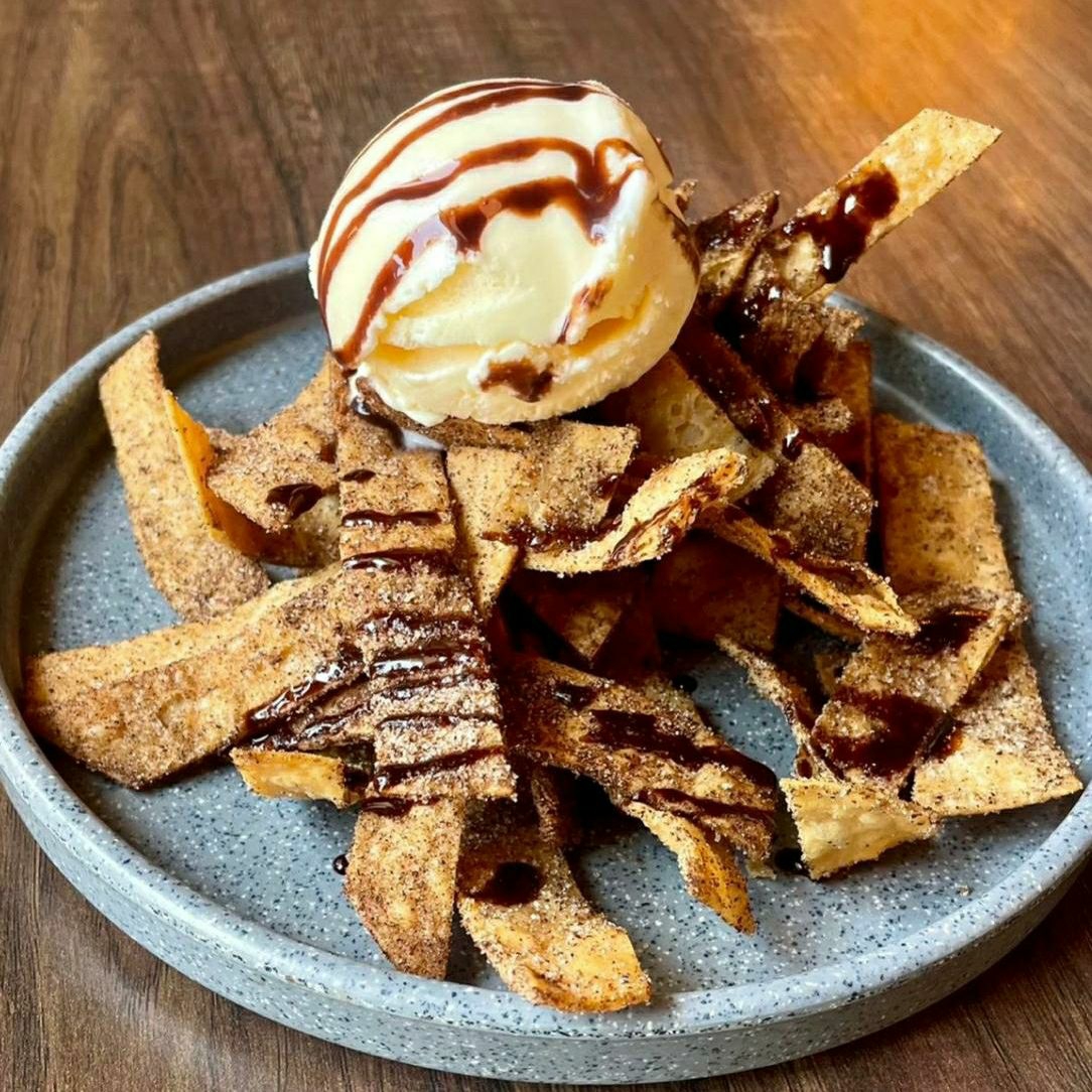 Deliciosas y crujientes tiras de buñuelo, espolvoreadas con azúcar y canela, chocolate liquido y bola de helado sabor vainilla.