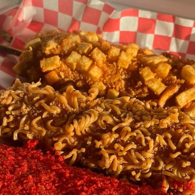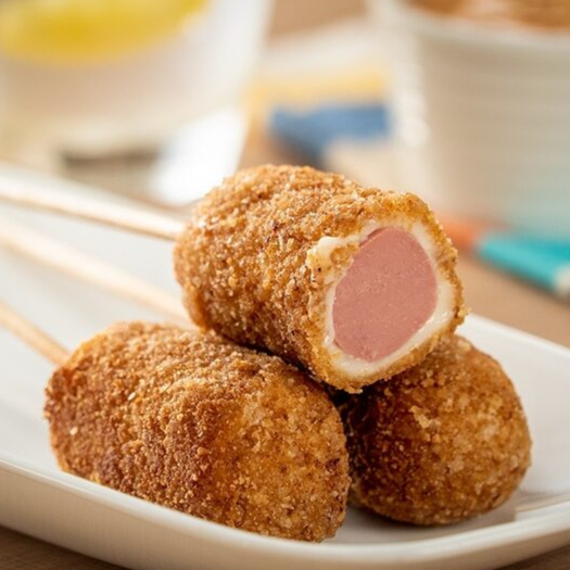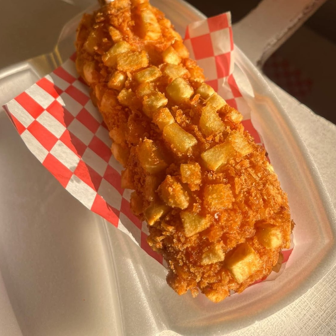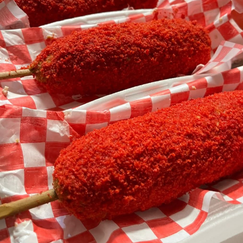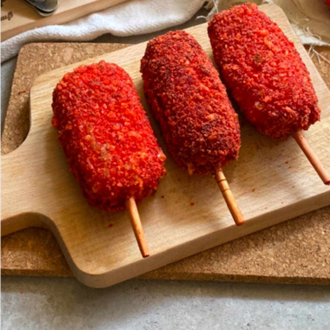 banderilla de mitad salchicha mitad queso cubierta de chips fuego