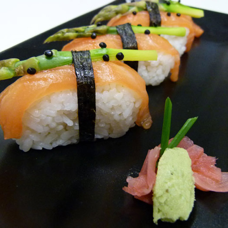 Un sushi fuera de lo común con la forma del Yin-Yang. Relleno de delicioso salmón, aguacate y pepino con alga por fuera.