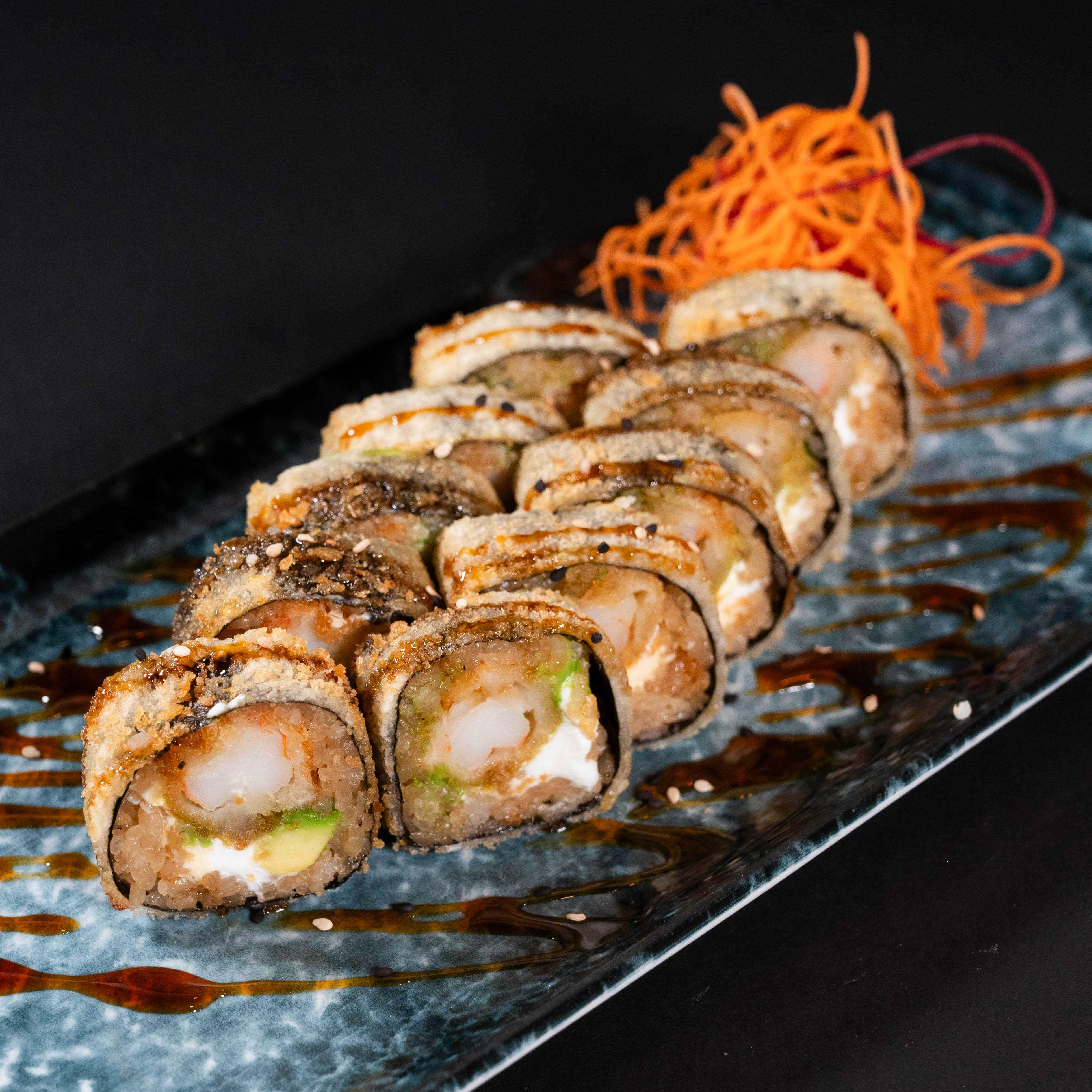 Camarón tempura, esparrago y queso crema por dentro, envuelto en laminas de aguacate y camarón fresco, coronado con tampico, tanuki, negi, ajonjolí, salsa de anguila.