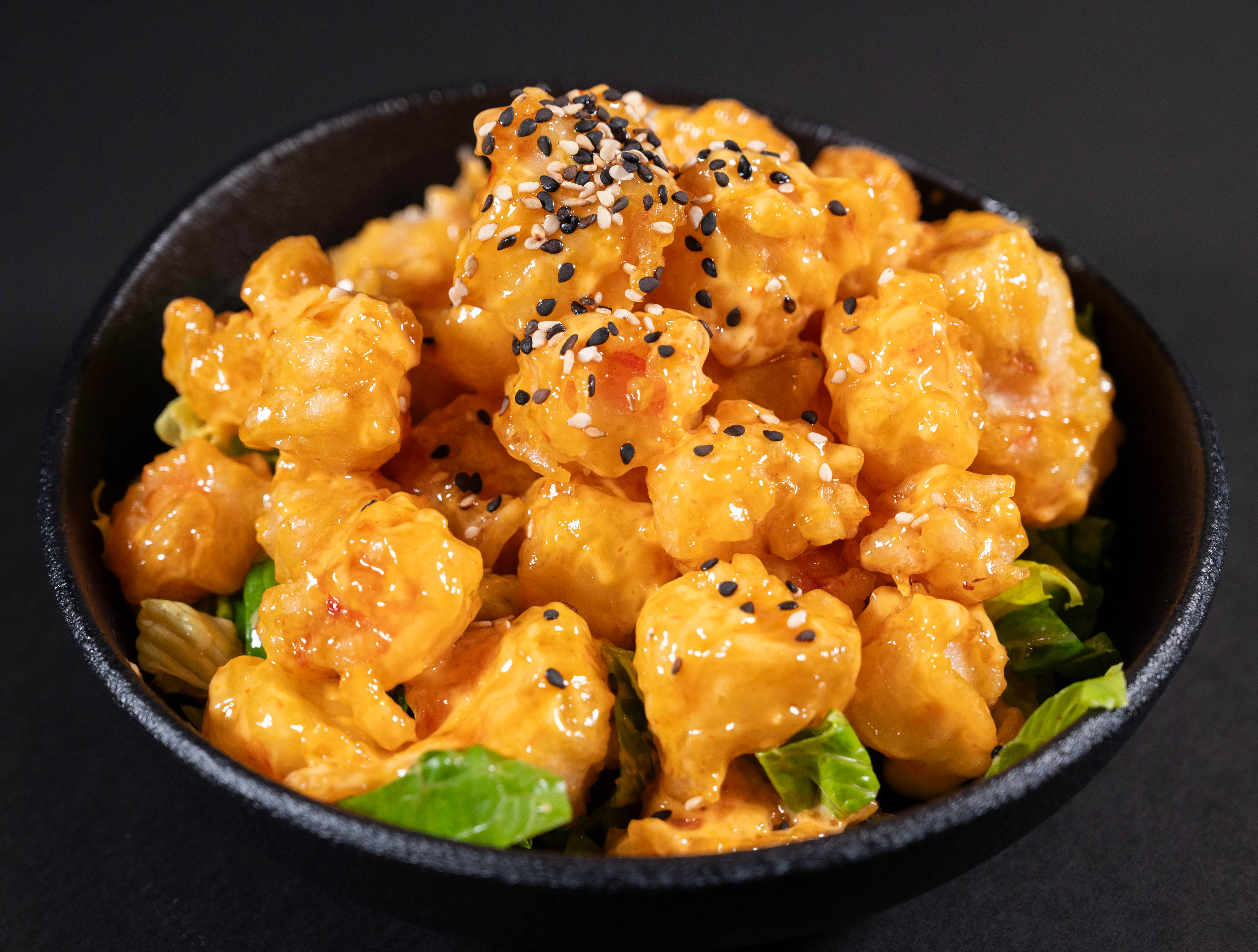Bowl de camarones crujientes con aderezo spicy, (180 gr).