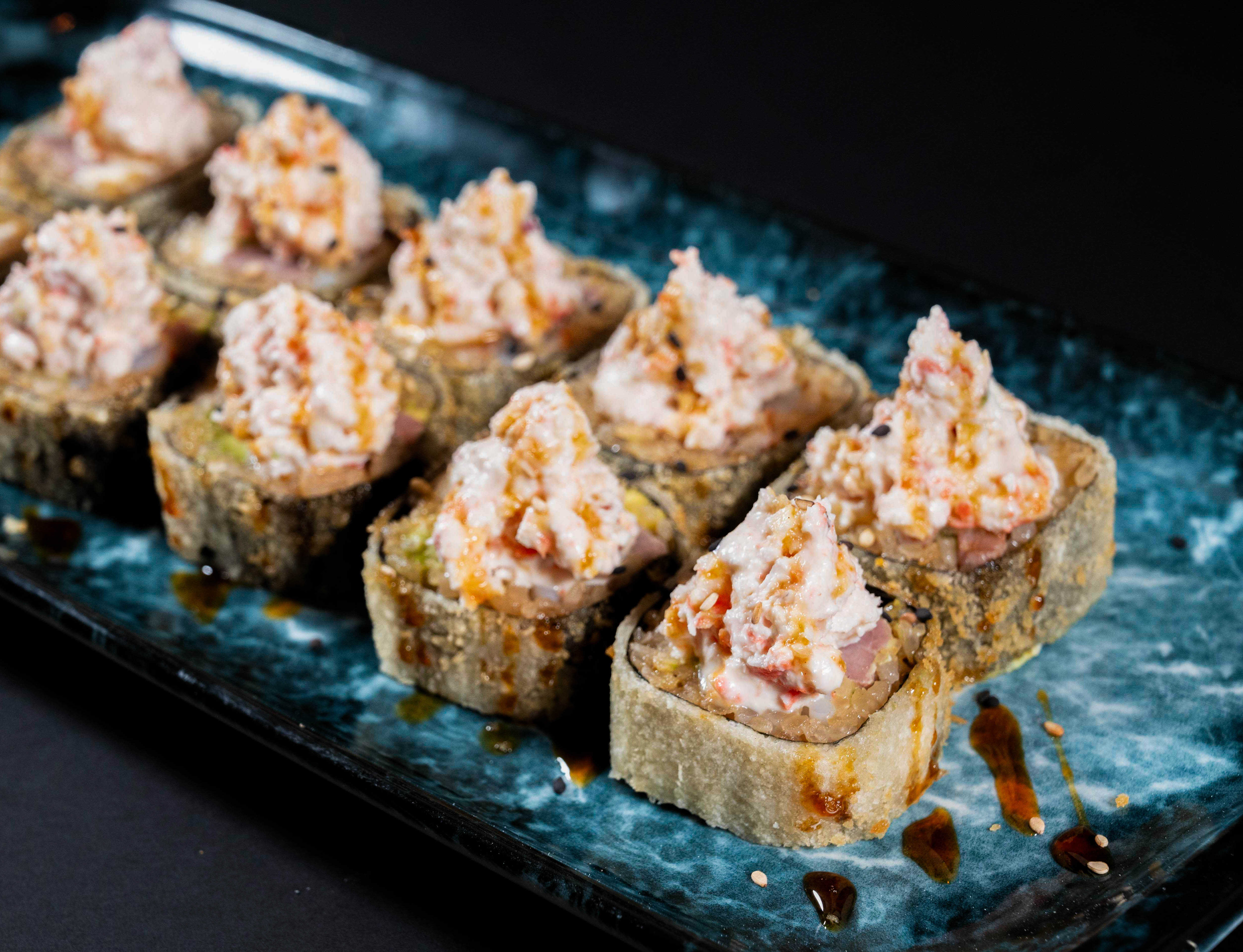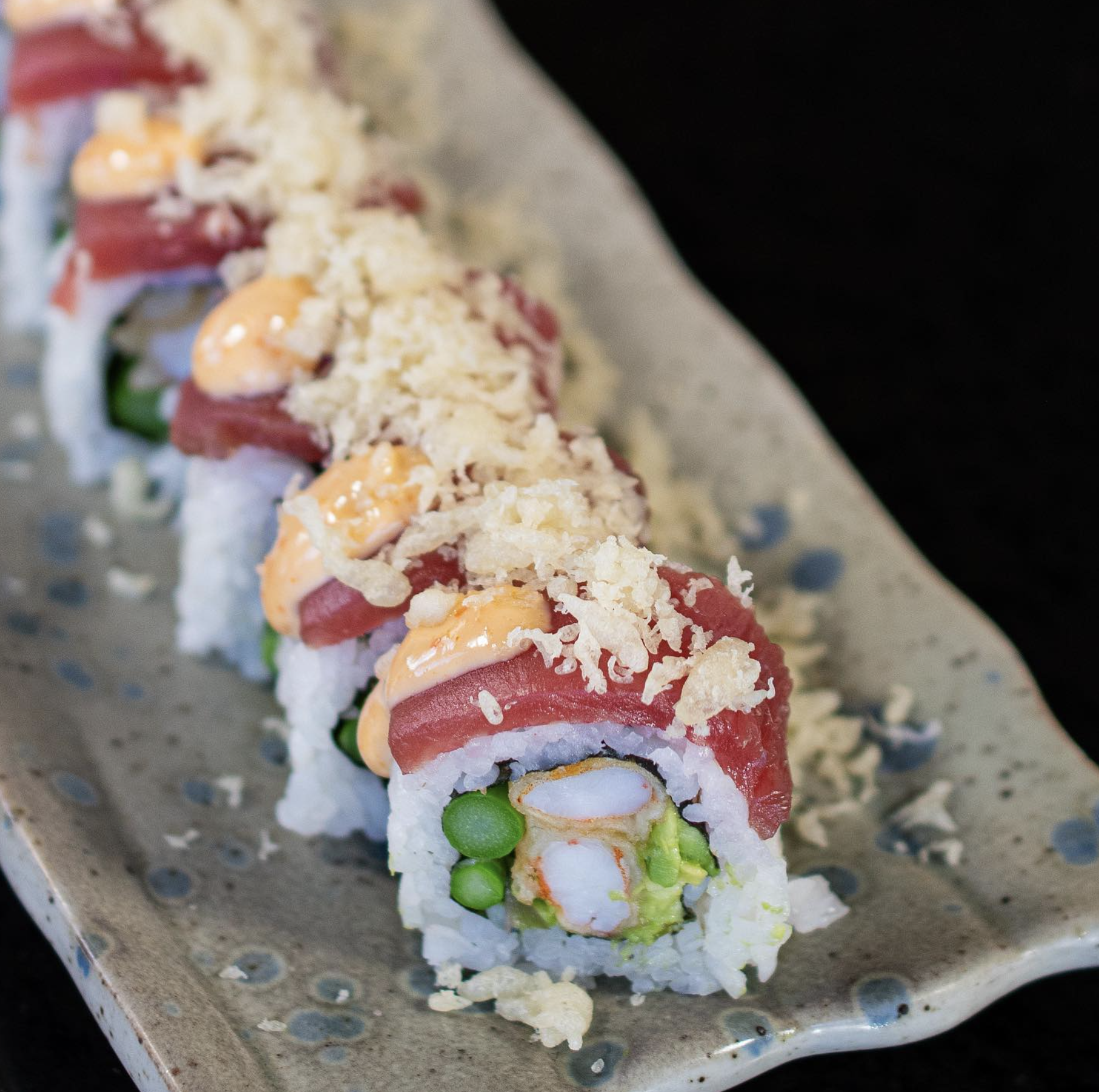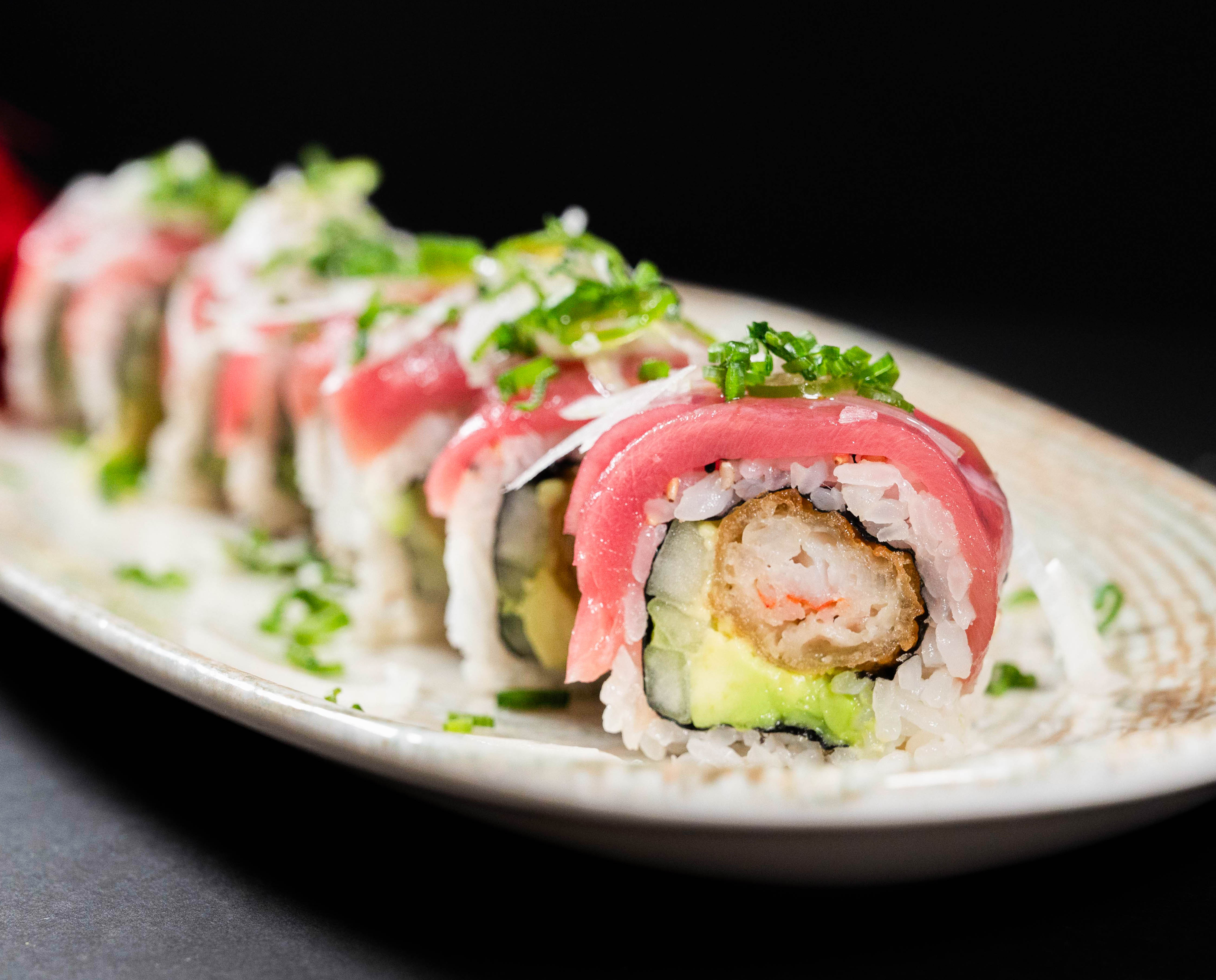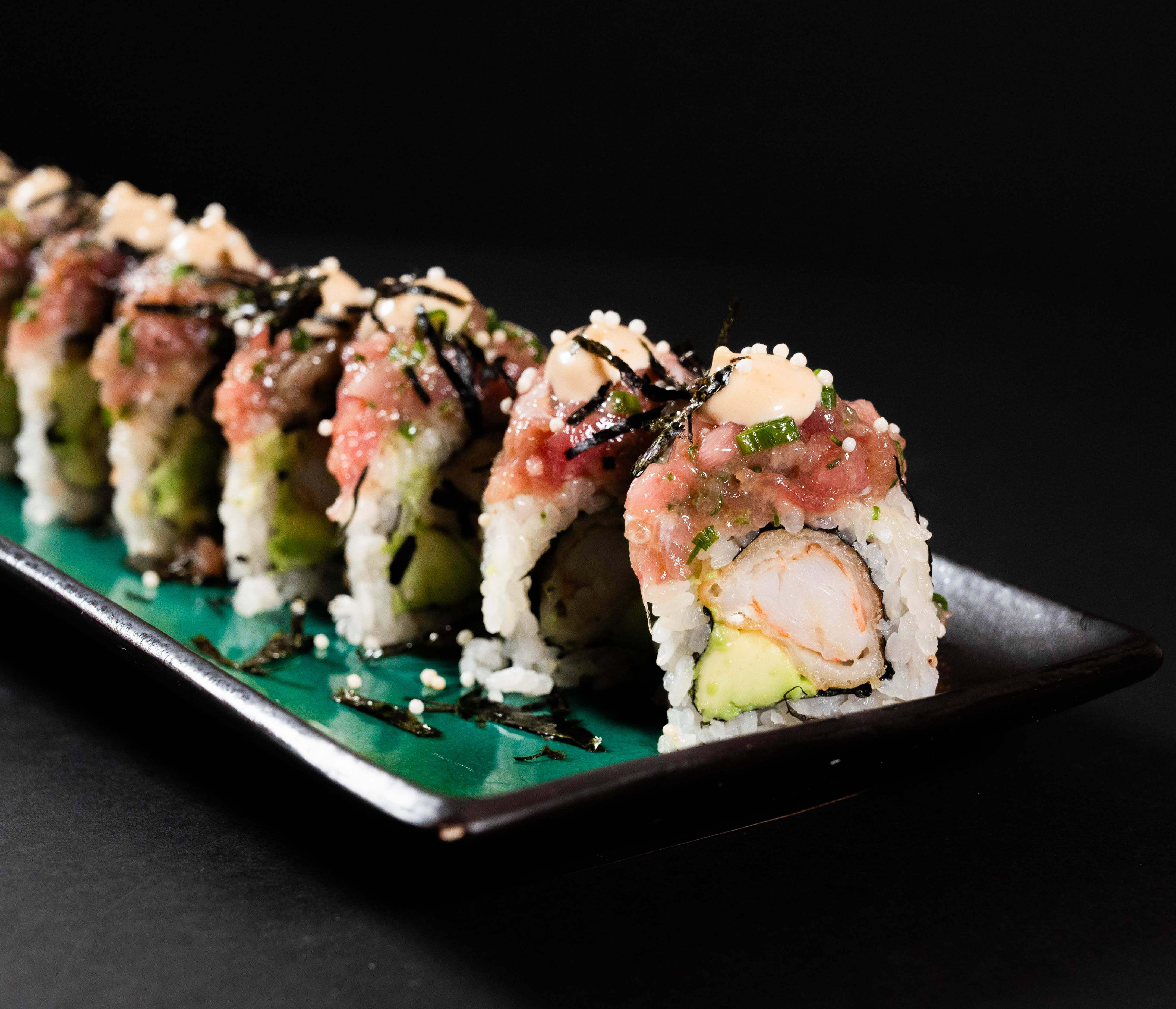 Rollo relleno de camarón capeado, esparrago, pepino y aguacate con atún marinado por fuera, burbujas de tempura y mayo spicy.