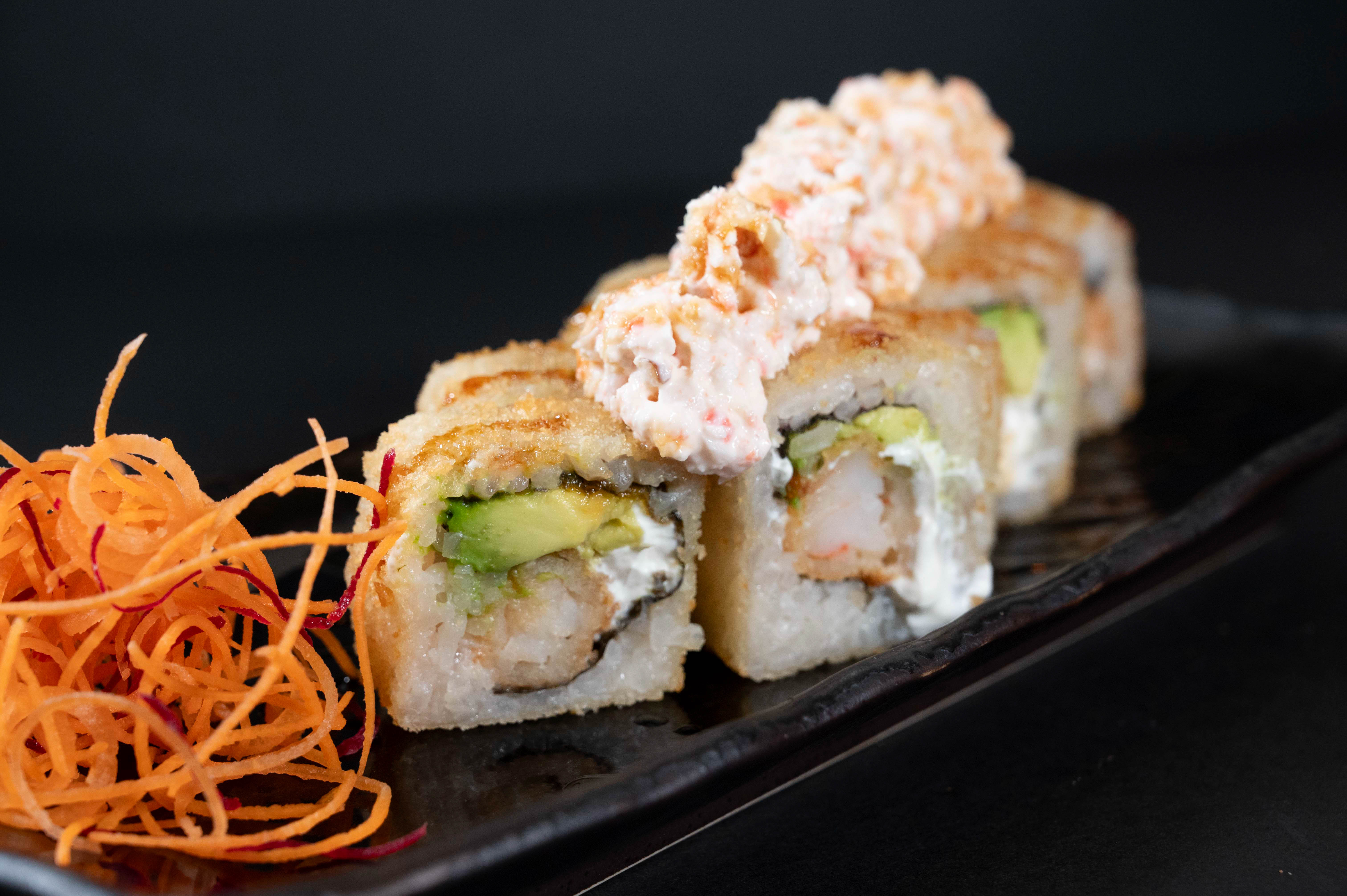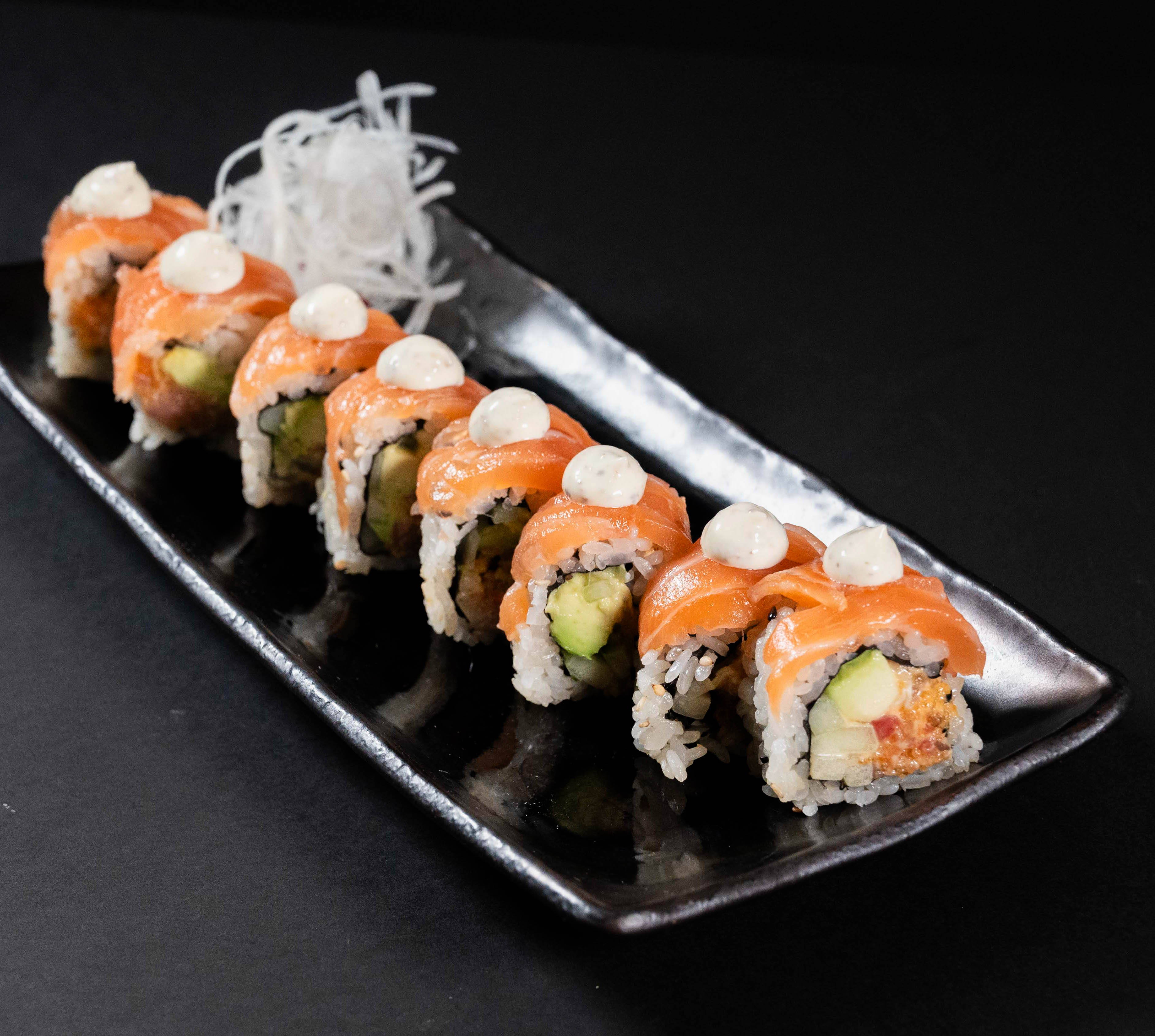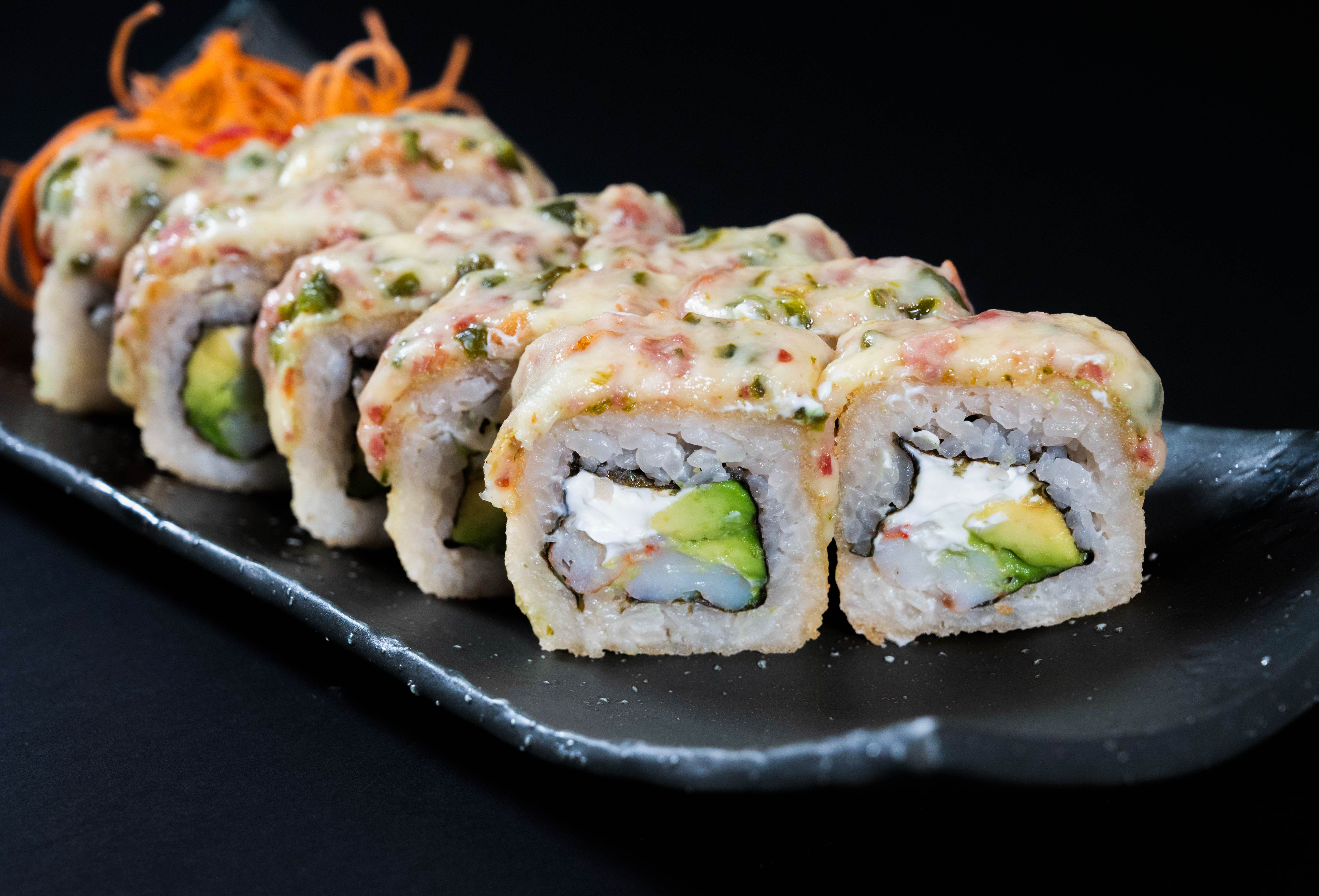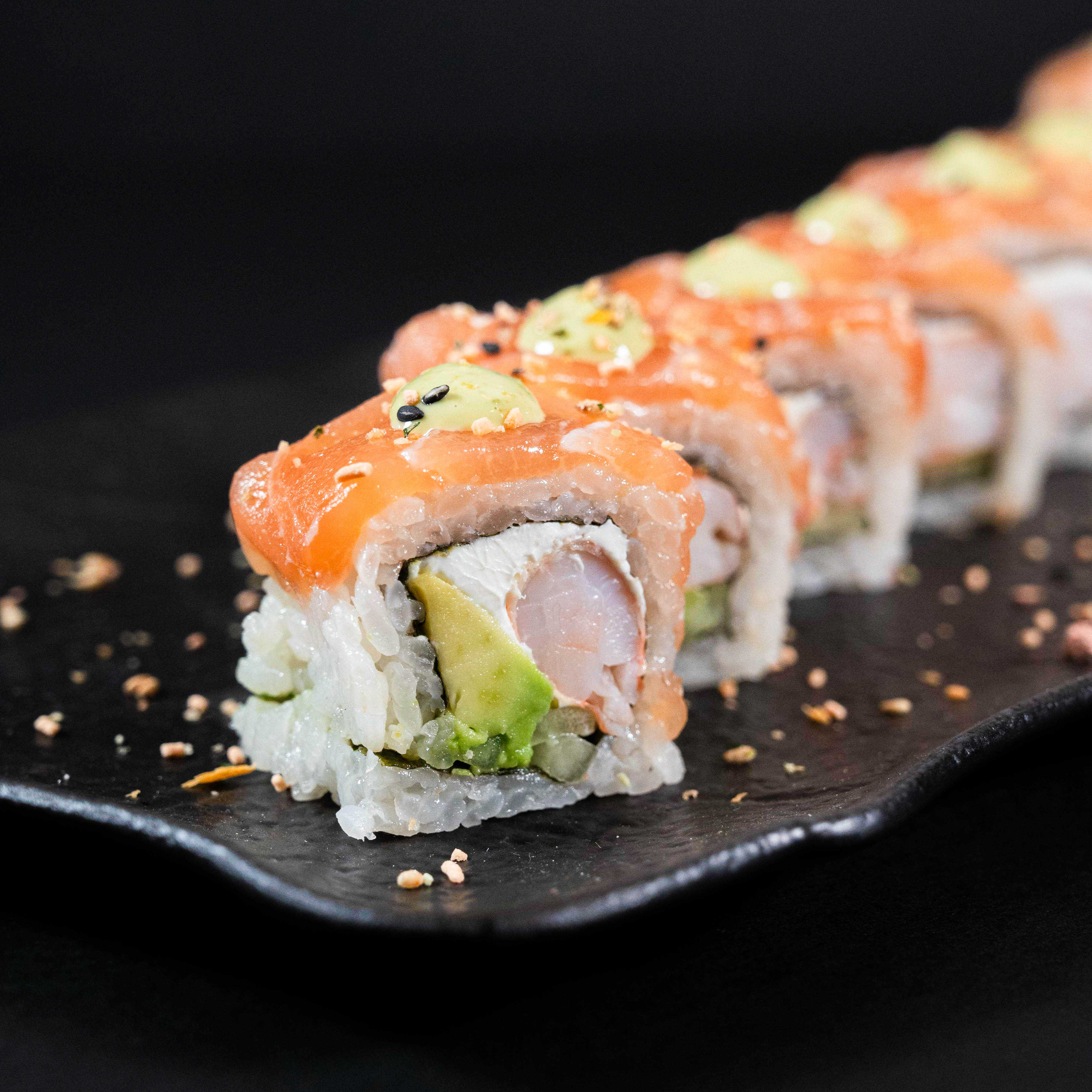 Queso crema y aguacate por dentro, salmón y topping de camarón hornado por fuera.