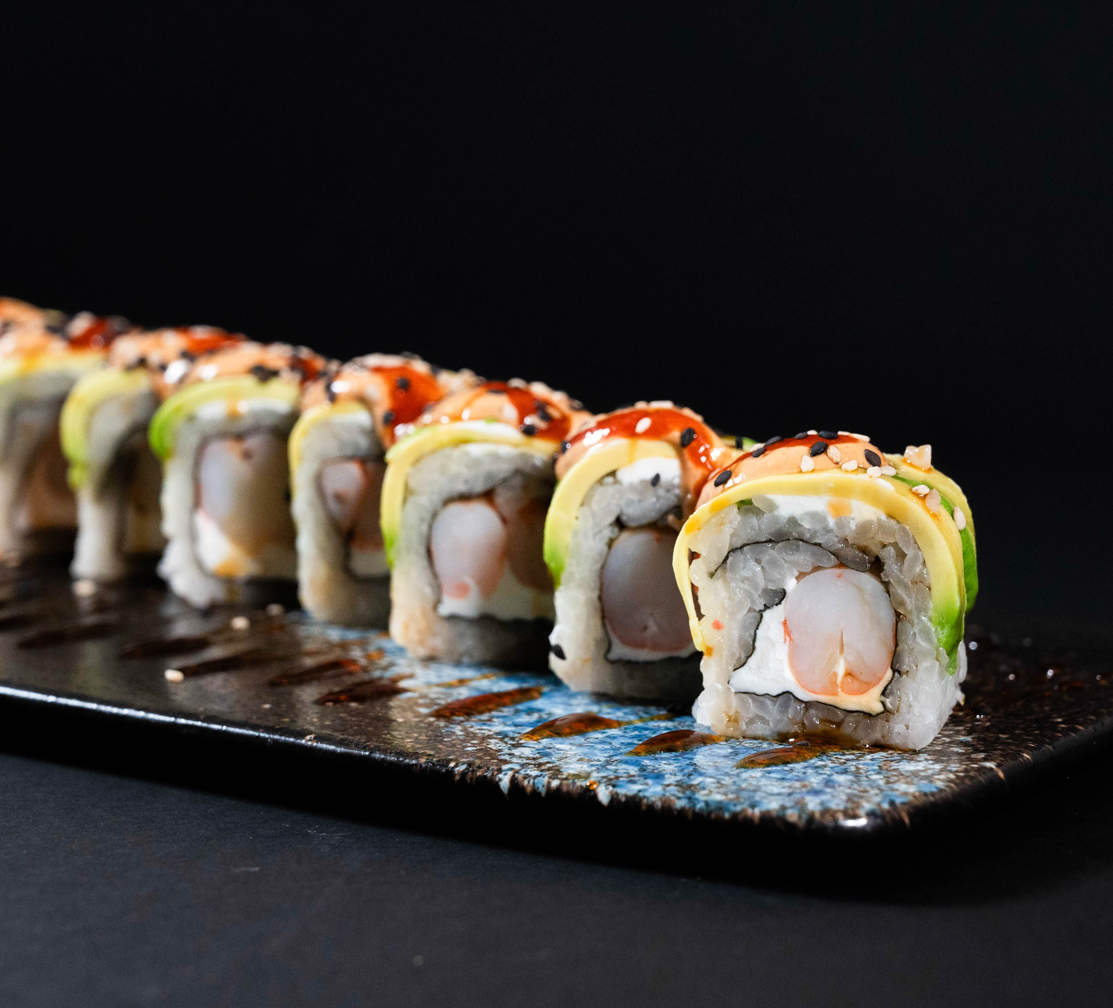 Camarón y queso crema, laminas de aguacate por fuera y adornado con salsa de anguila, siracha y chipotle.