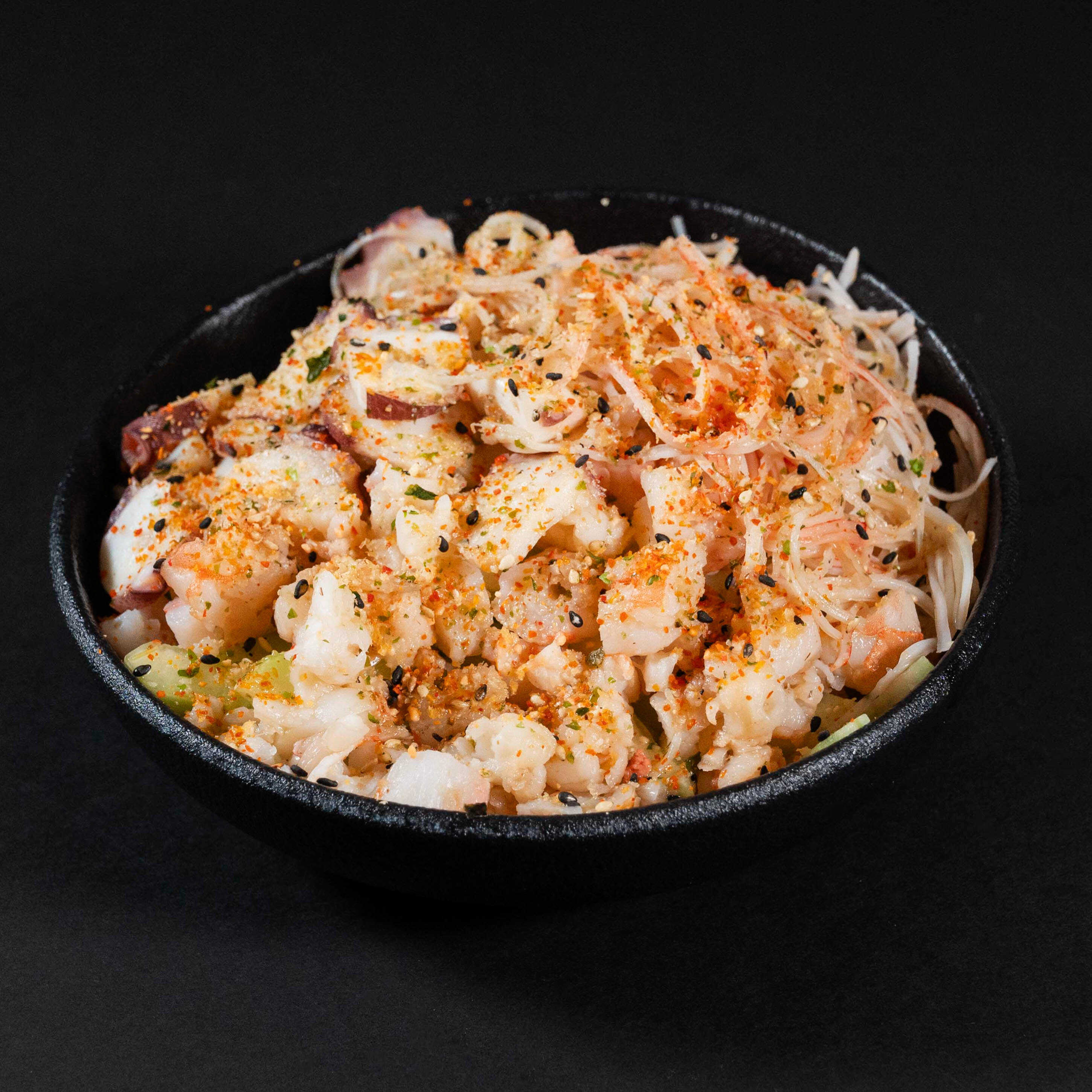 Bowl de arroz, con un topping de pescado prime, cubos de mango, edamanes, noodles de pepino y aguacate.