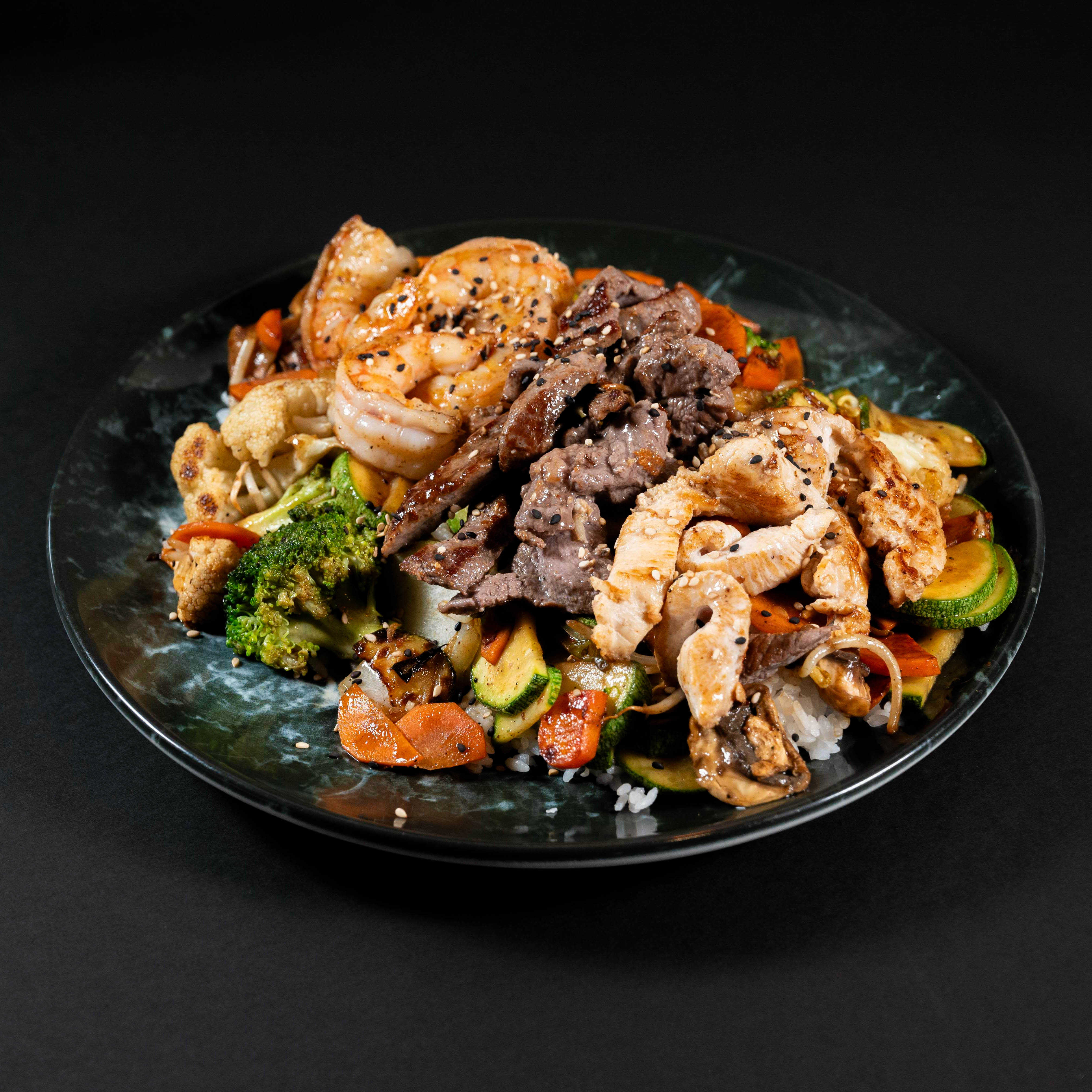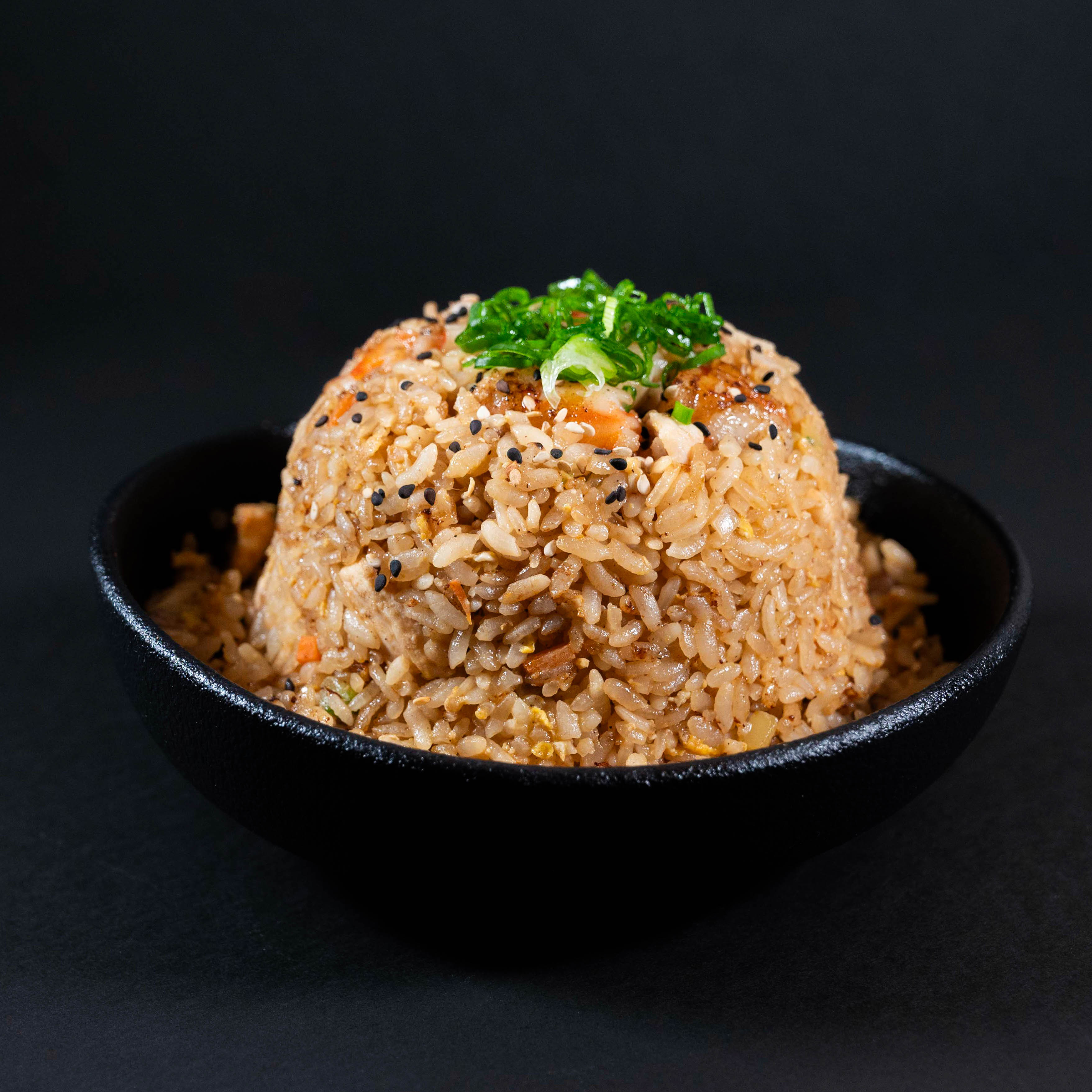 Arrzo frito, arrachera, camarón, queso crema, aguacate y tampico.