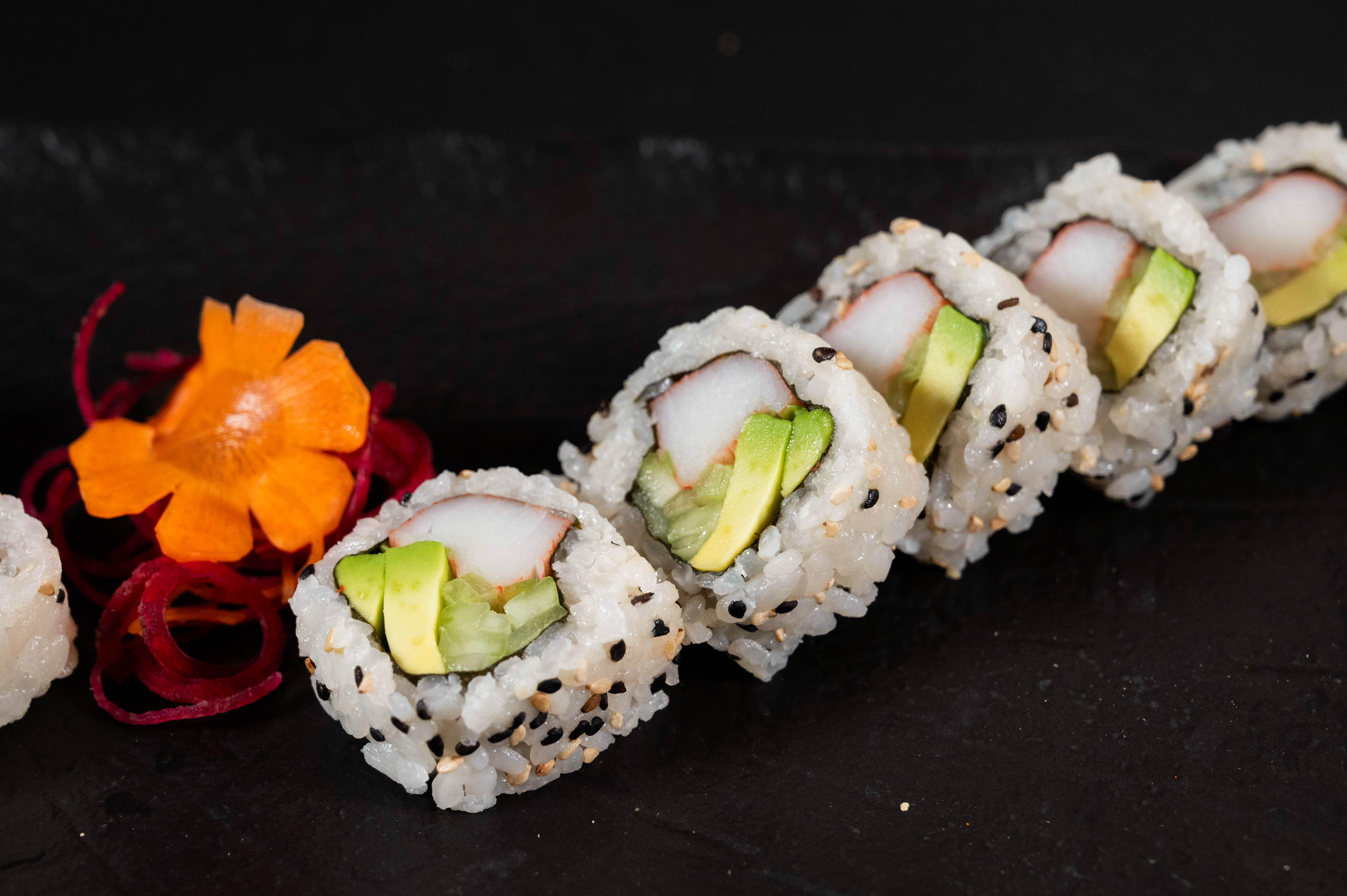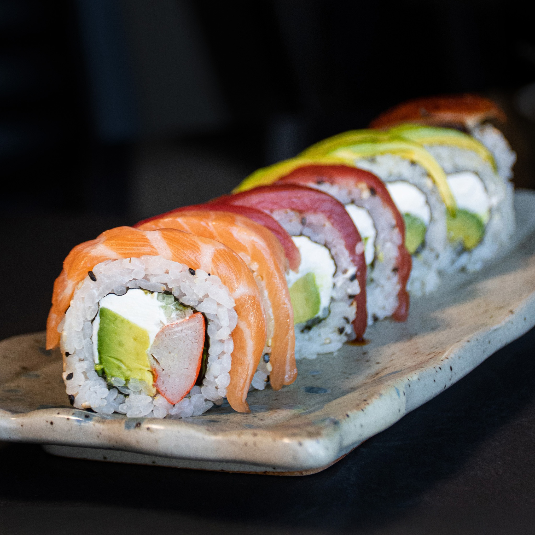Kani Kama, queso crema, pepino y aguacate por dentro, filete de anguila, salmón, atún y agucate por fuera.