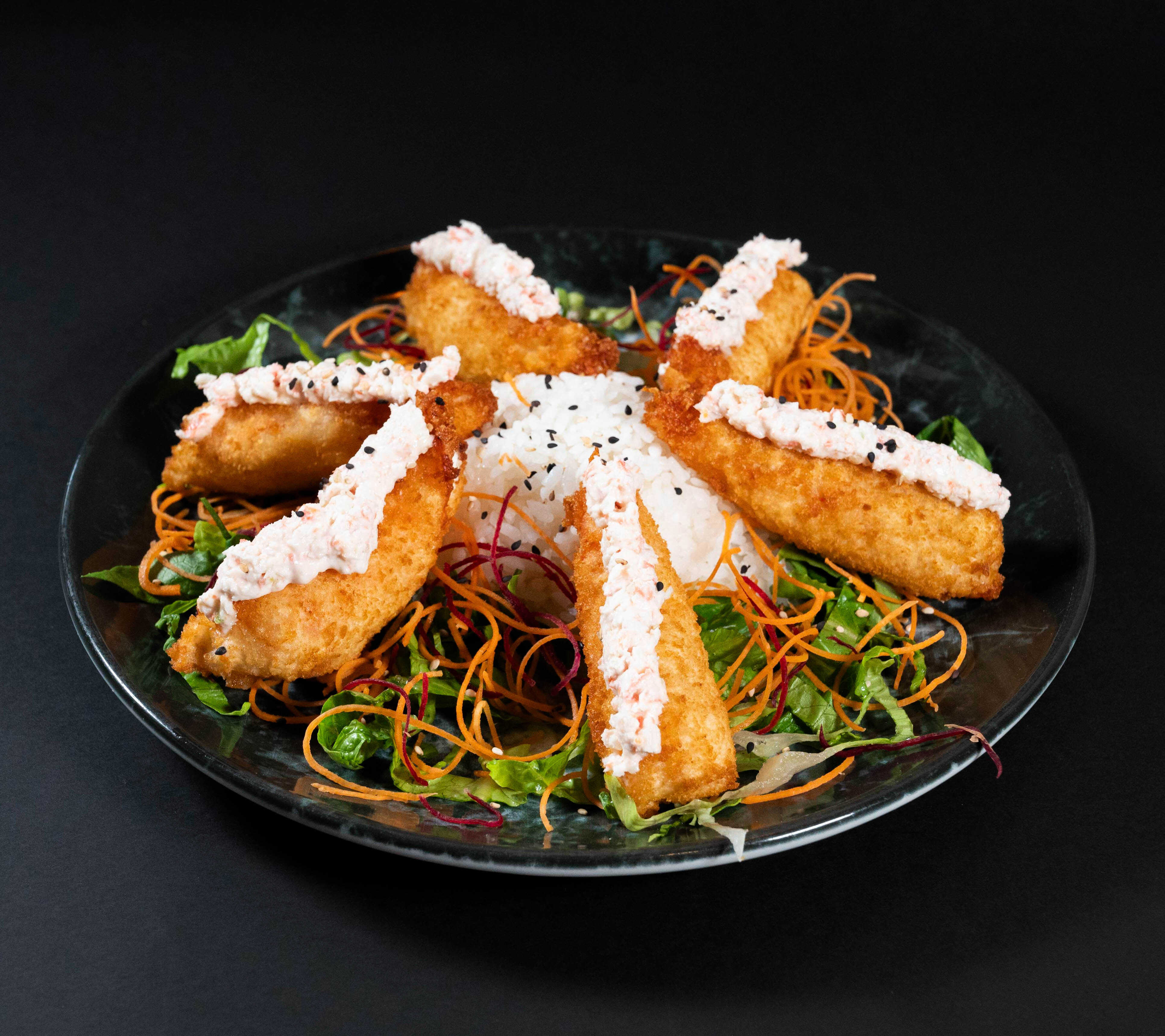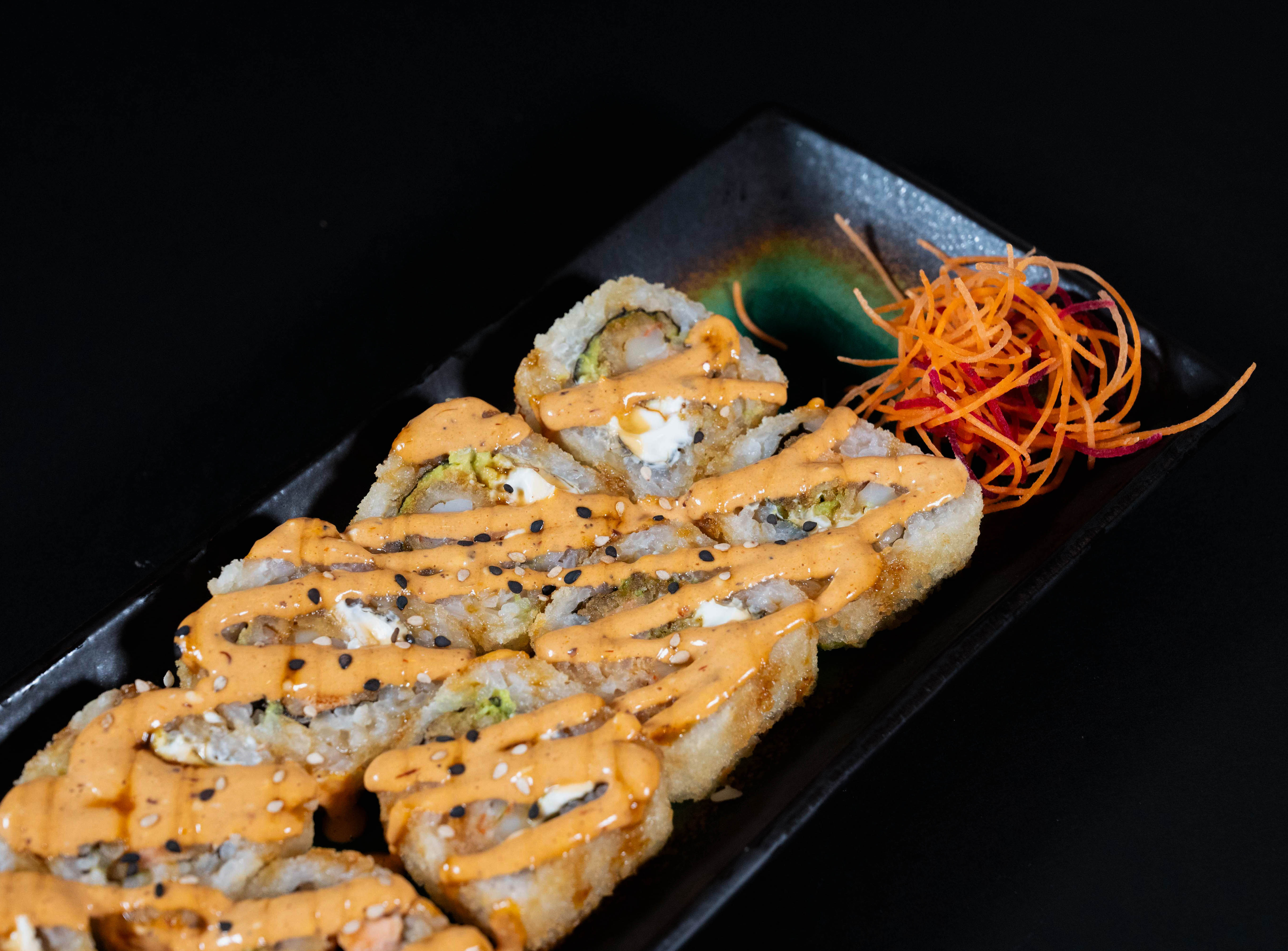 Salmón y camaróm empanizados, queso y aguacate por dentro con aderezos chipotle.