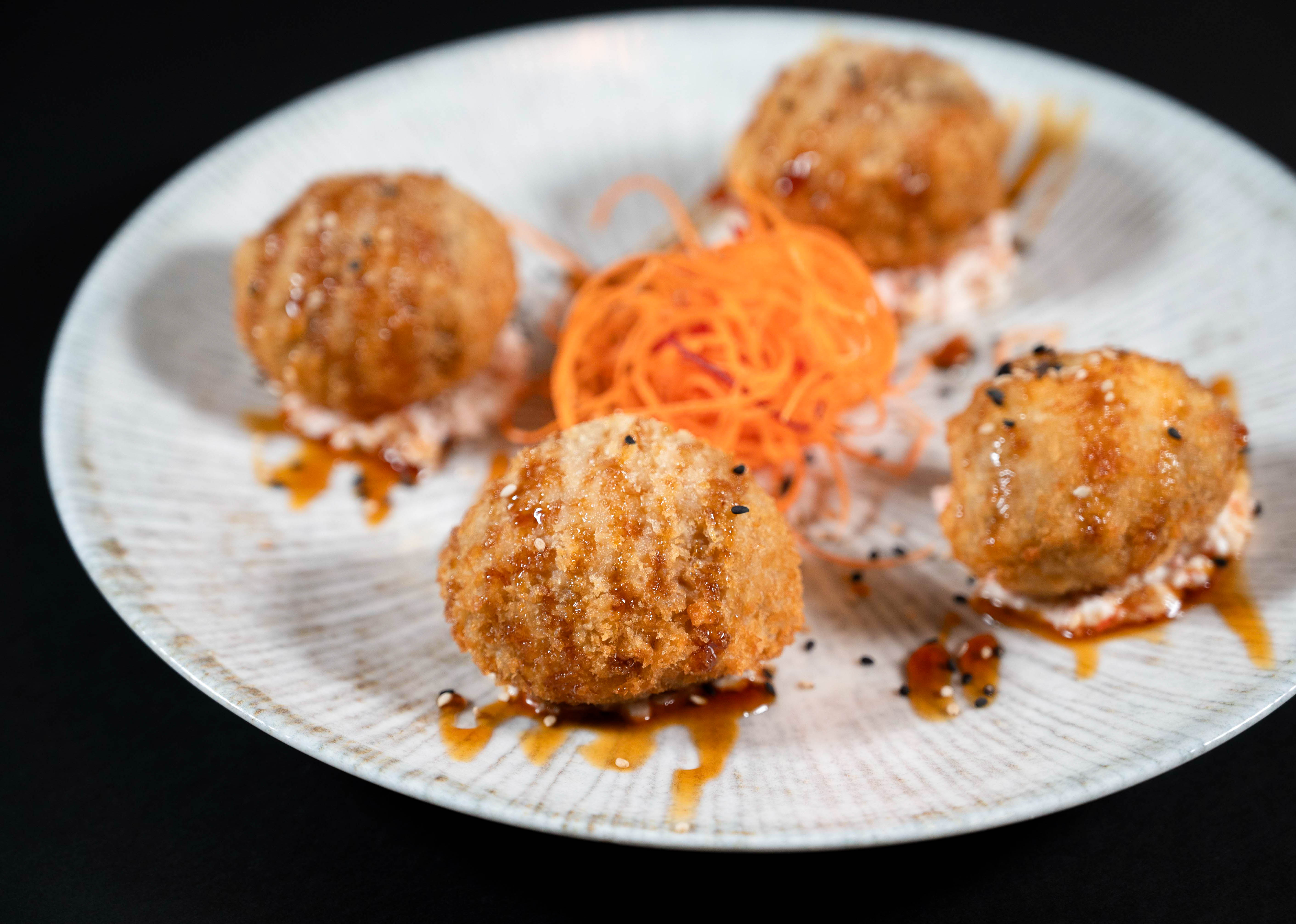 Fresco, arroz por fuera espolvoreado en ajonjolí, por dentro atún con mayonesa de trufa y tanuki.