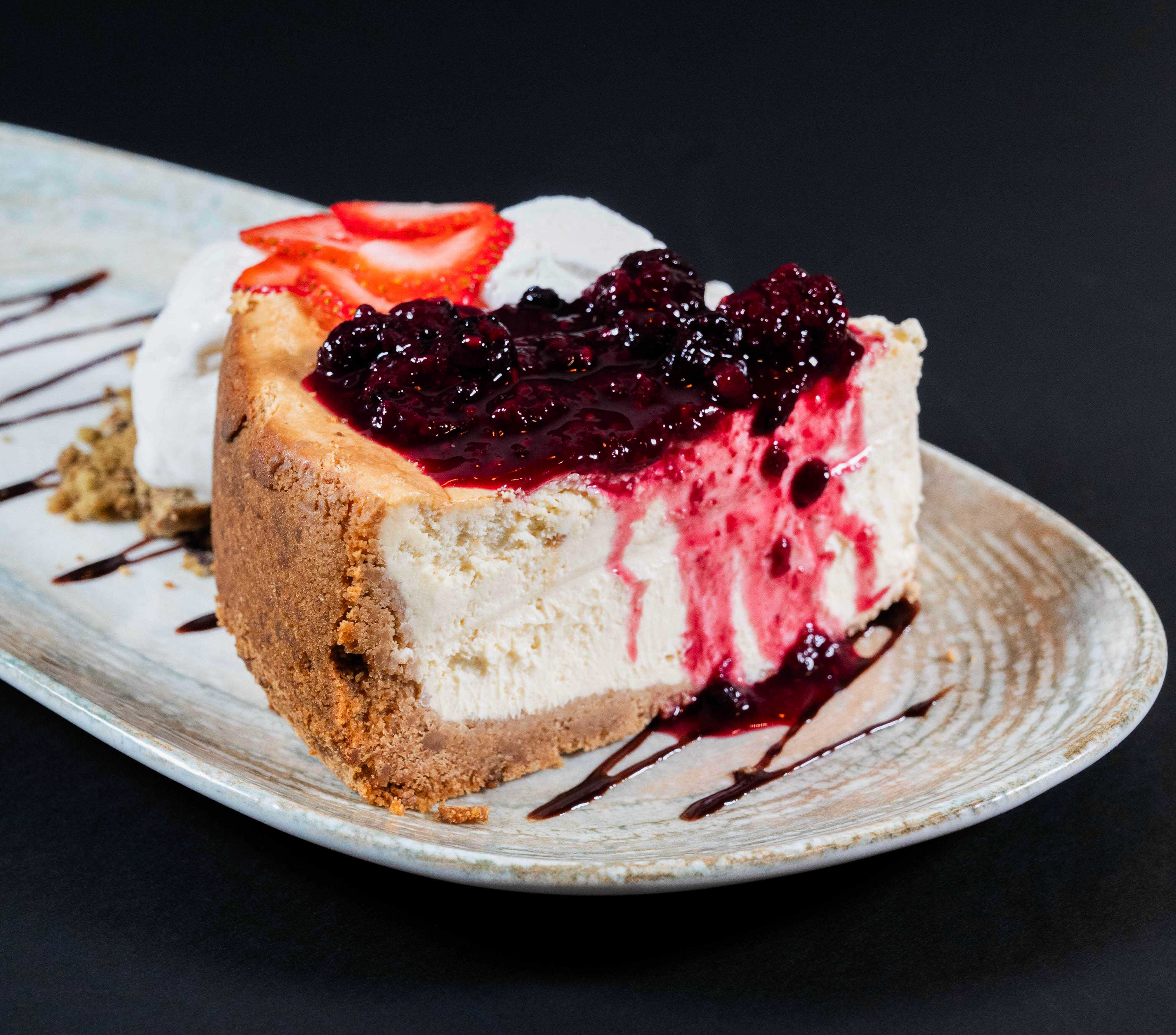 Cremoso cheescake estilo Nueva York, con coulis de frutos rojos y nieve de coco.