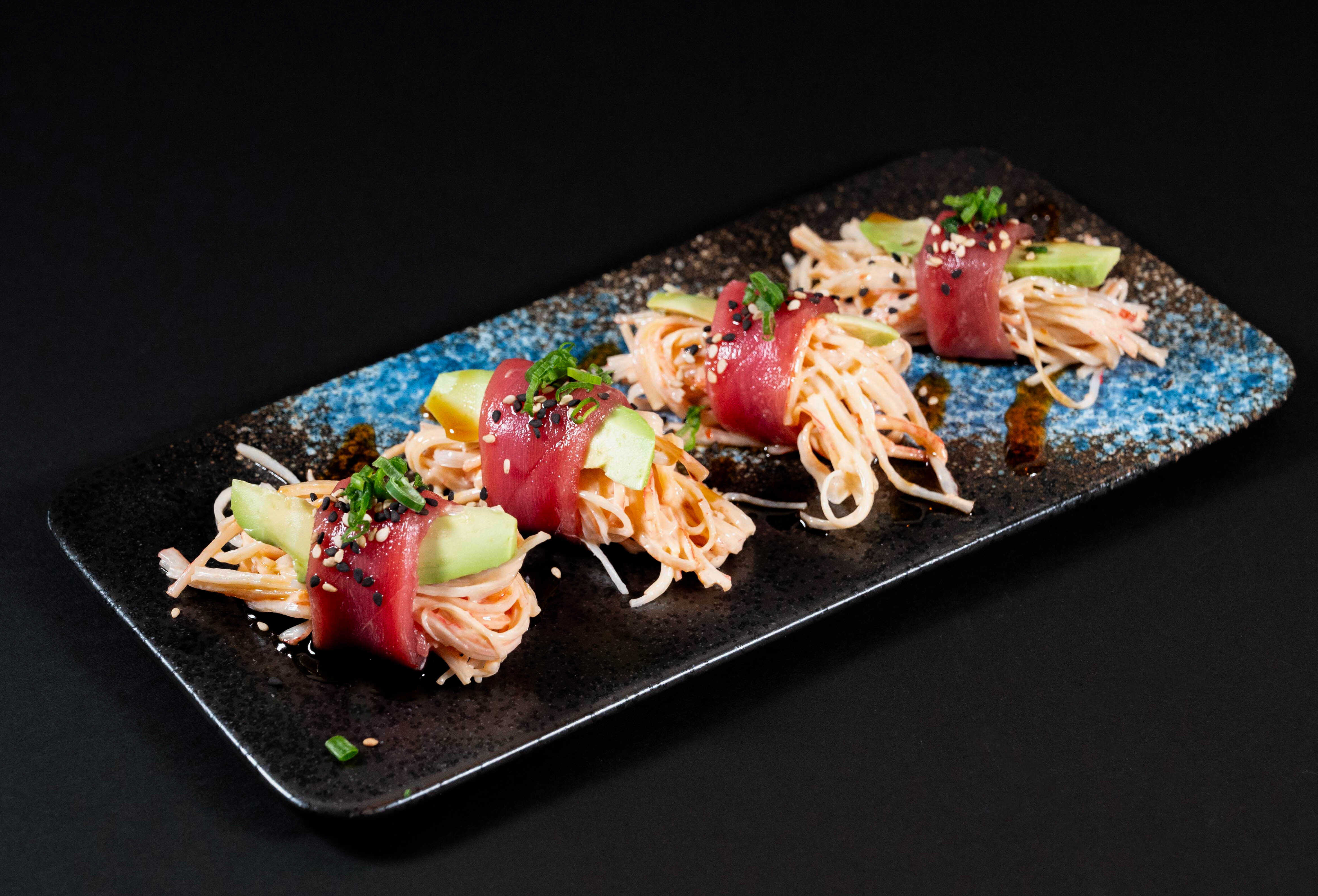4 Piezas. laminas de atún aleta azul o salmón, rellenas de kanikama spicy con aguacate.