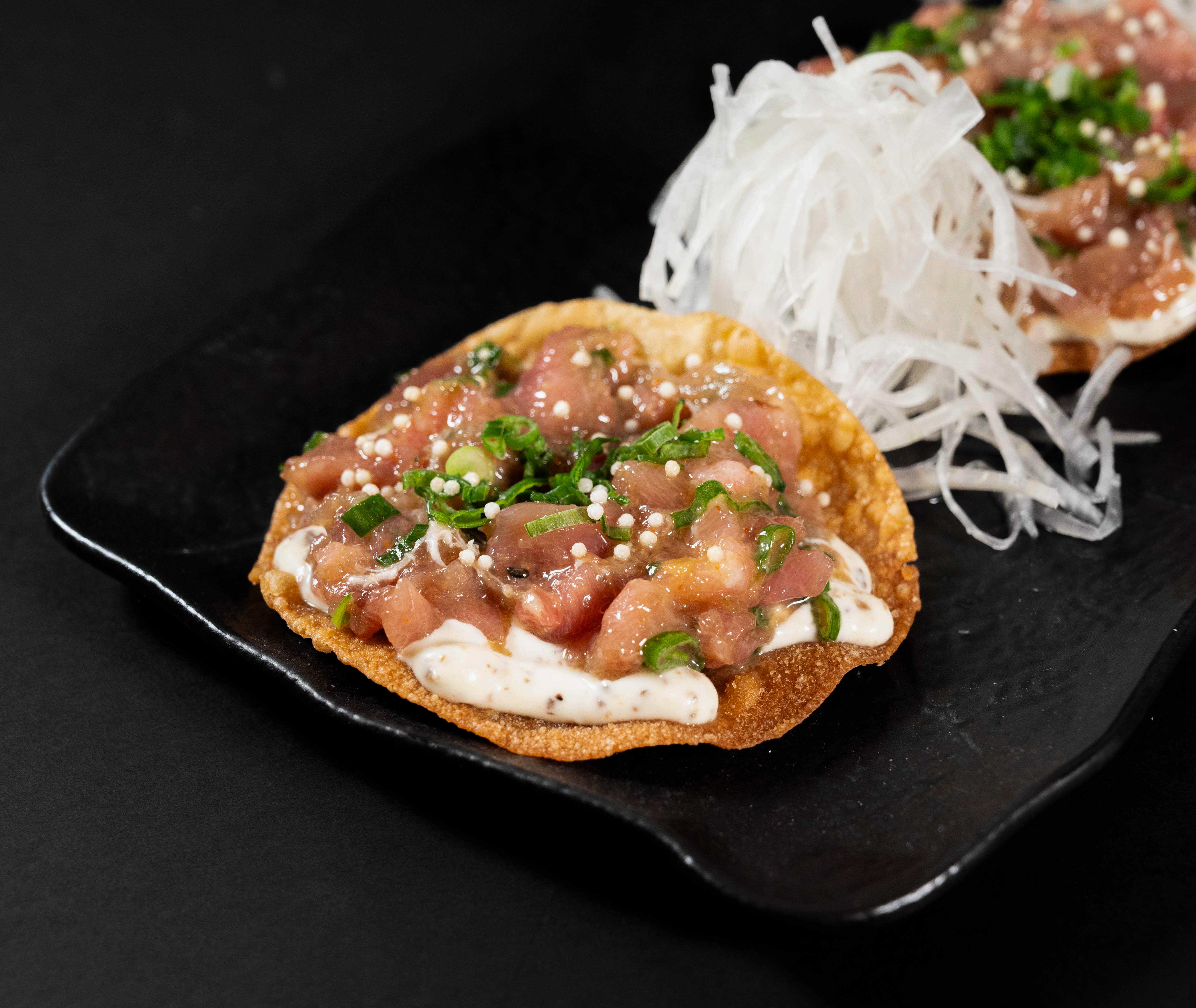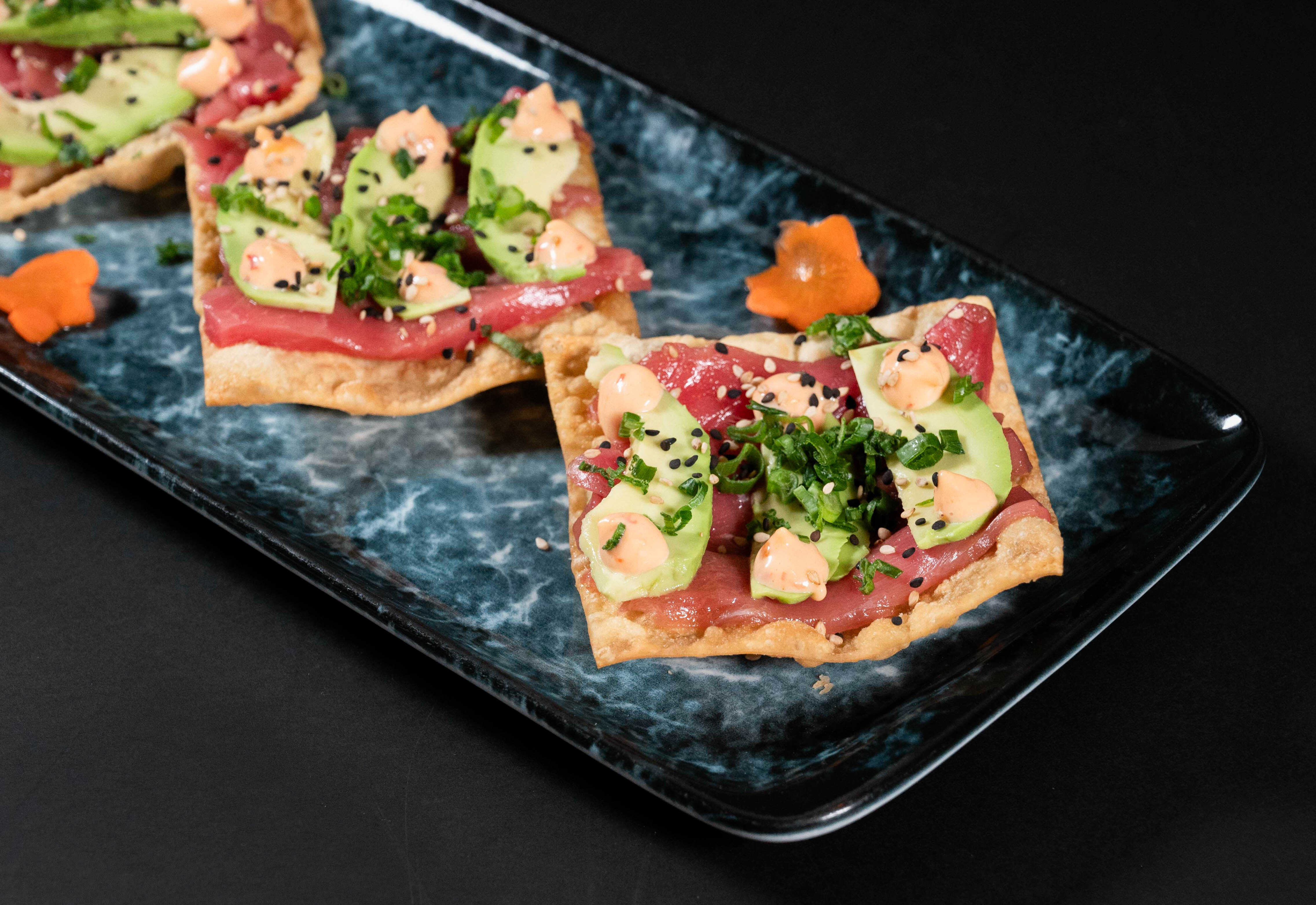 3 Piezas, lamina de aguacate y atún fresco bañadas en salsa poke y aderezo chipotle.