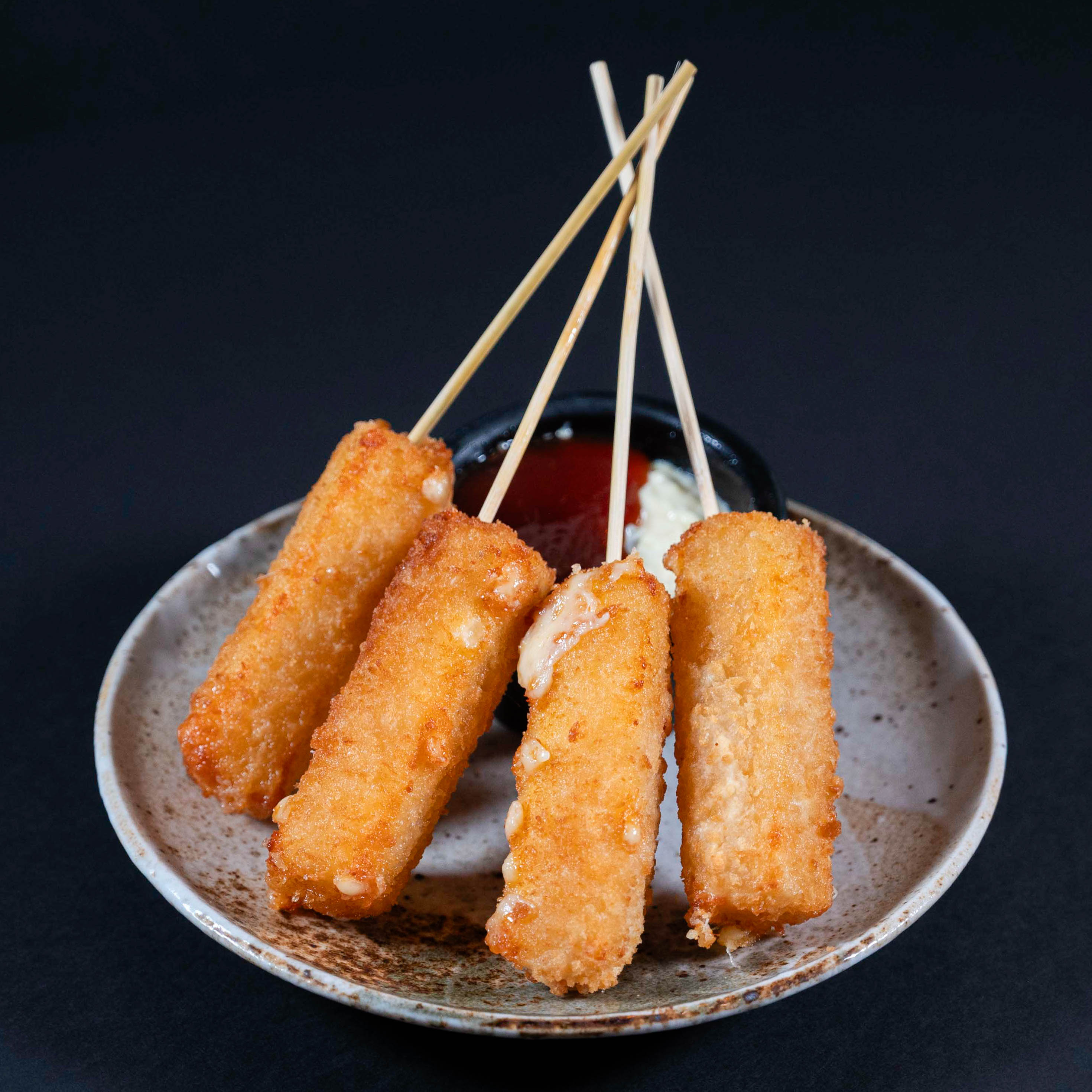 4 Deliciosos dedos de queso empanizados acompañados de aderezo blanco y agridulce.