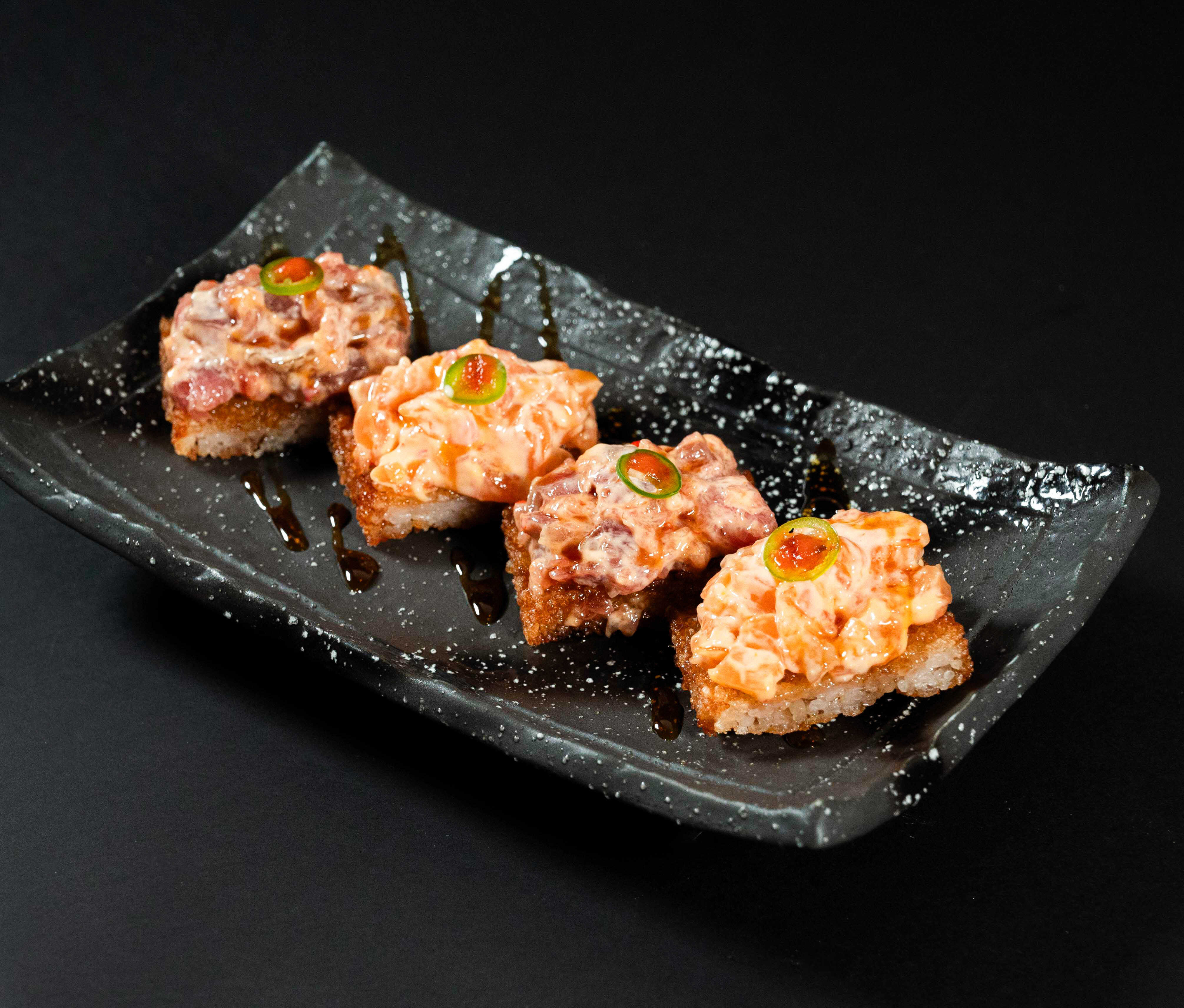 Bocadillos de arroz crujiente, coronados con atún spicy y salmón spicy.