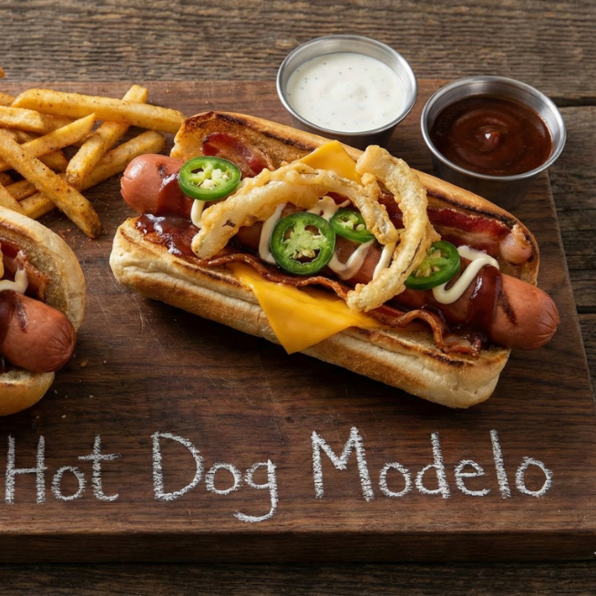 Salchicha jumbo de pavo, queso amarillo, tocino, salsa BBQ, mayonesa, jalapeño y trozos de cebolla. Incluye papas fritas.