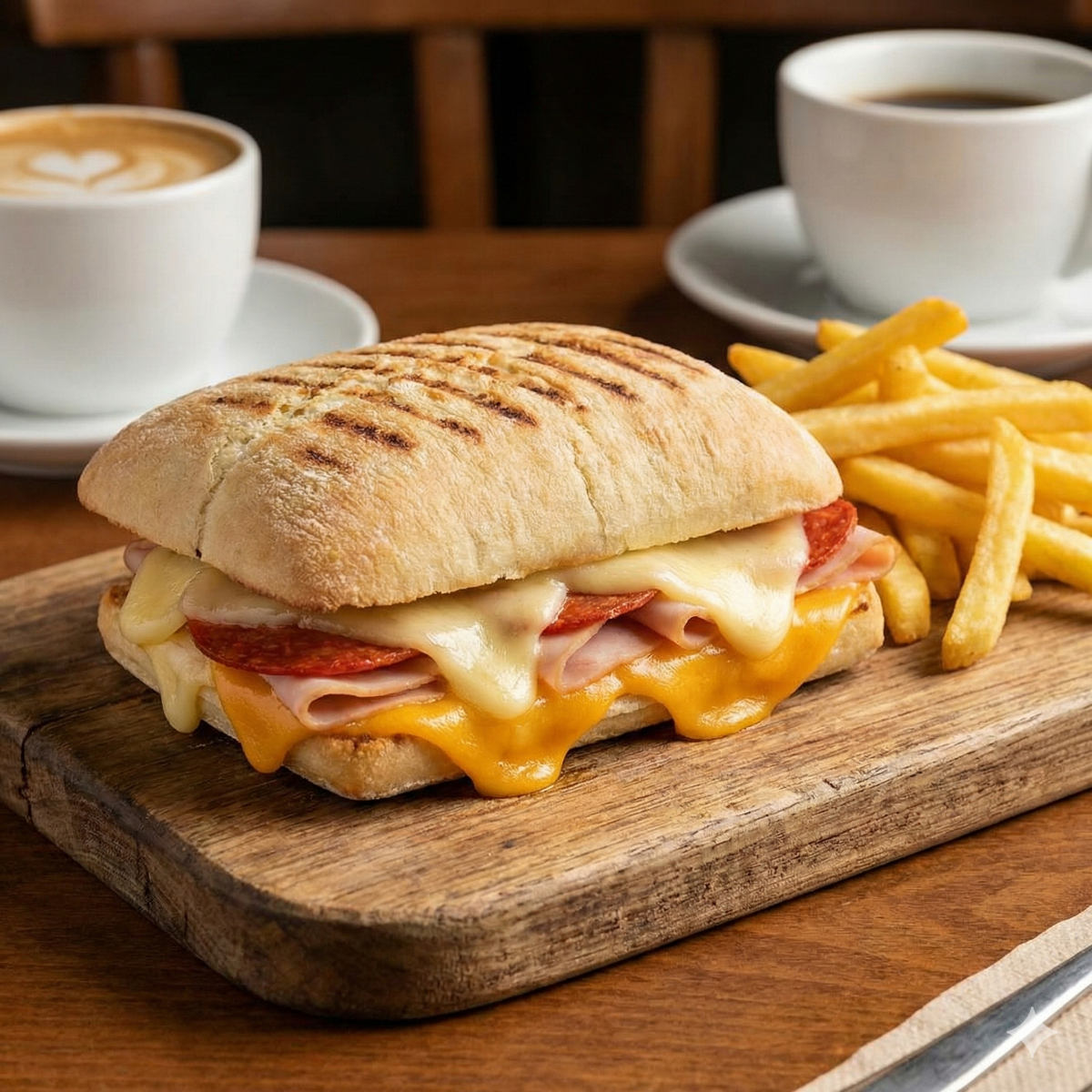 Queso manchego, provolone y cheddar. 80 g De jamón de pavo y 20 g de pepperoni. Incluye papas fritas.
