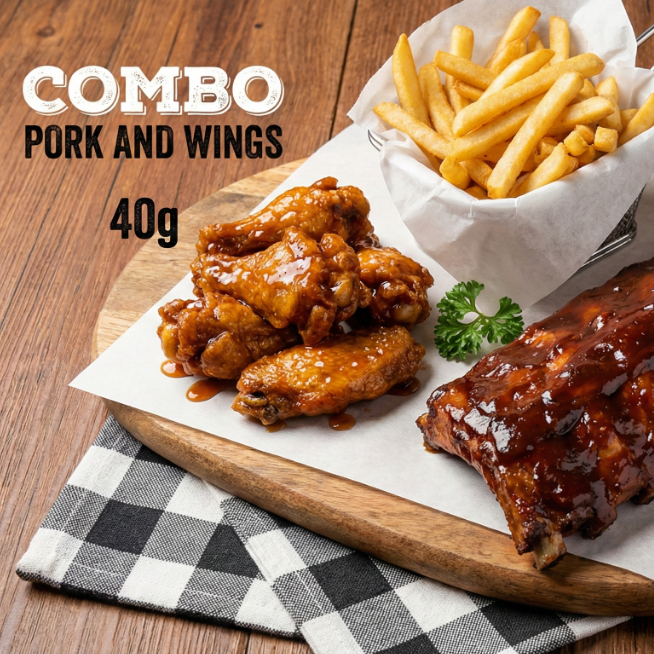 240 g De alitas normales en cualquiera de nuestras salsas, 1 ordèn de papas a la francesa, 300 g de costilla de puerco en salsa BBQ o salsa buffalo.
