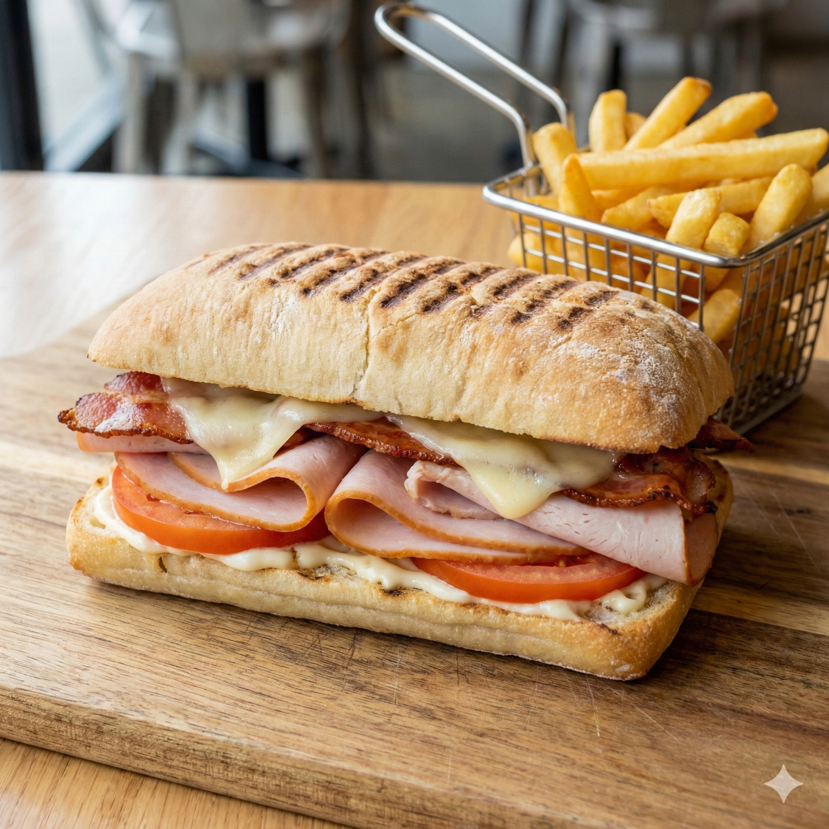 100 g De jamón de pavo, 4 rebanadas de tocino, tomate, queso y mayonesa. Incluye papas fritas.