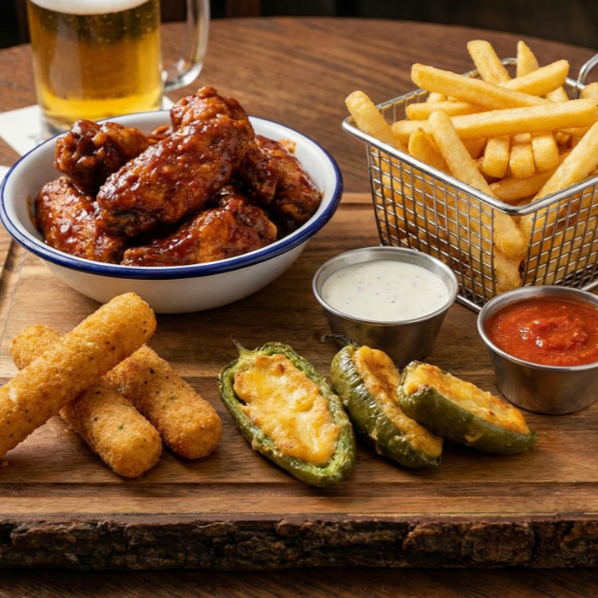 250 g De alitas normales en cualquiera de nuestras salsas, 1 orden de papas a la francesa, 4 dedos mozzarella y 4 jalapeños poppers, incluye 1 aderezo ranch y 1 aderezo de salsa marinara.