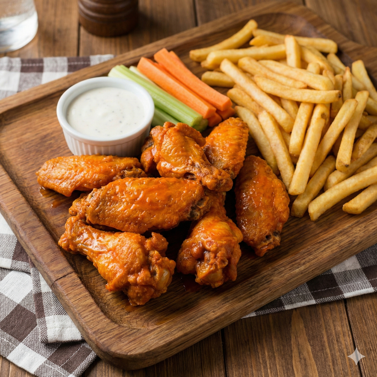 Ordèn de 300 g de alas de pollo (de 7 a 10 alas depende el tamaño) fritas, bañadas en salsa de su elección, acompañadas de aderezo ranch y 120 g de papas a la francesa.