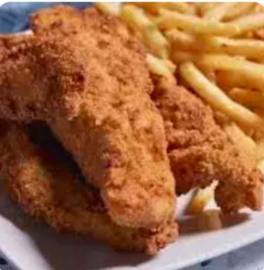 250 g De fajitas de pollo (100% pechuga de pollo) empanizados, acompañados de papas a la francesa (120 g) bañadas en salsa de su elección.