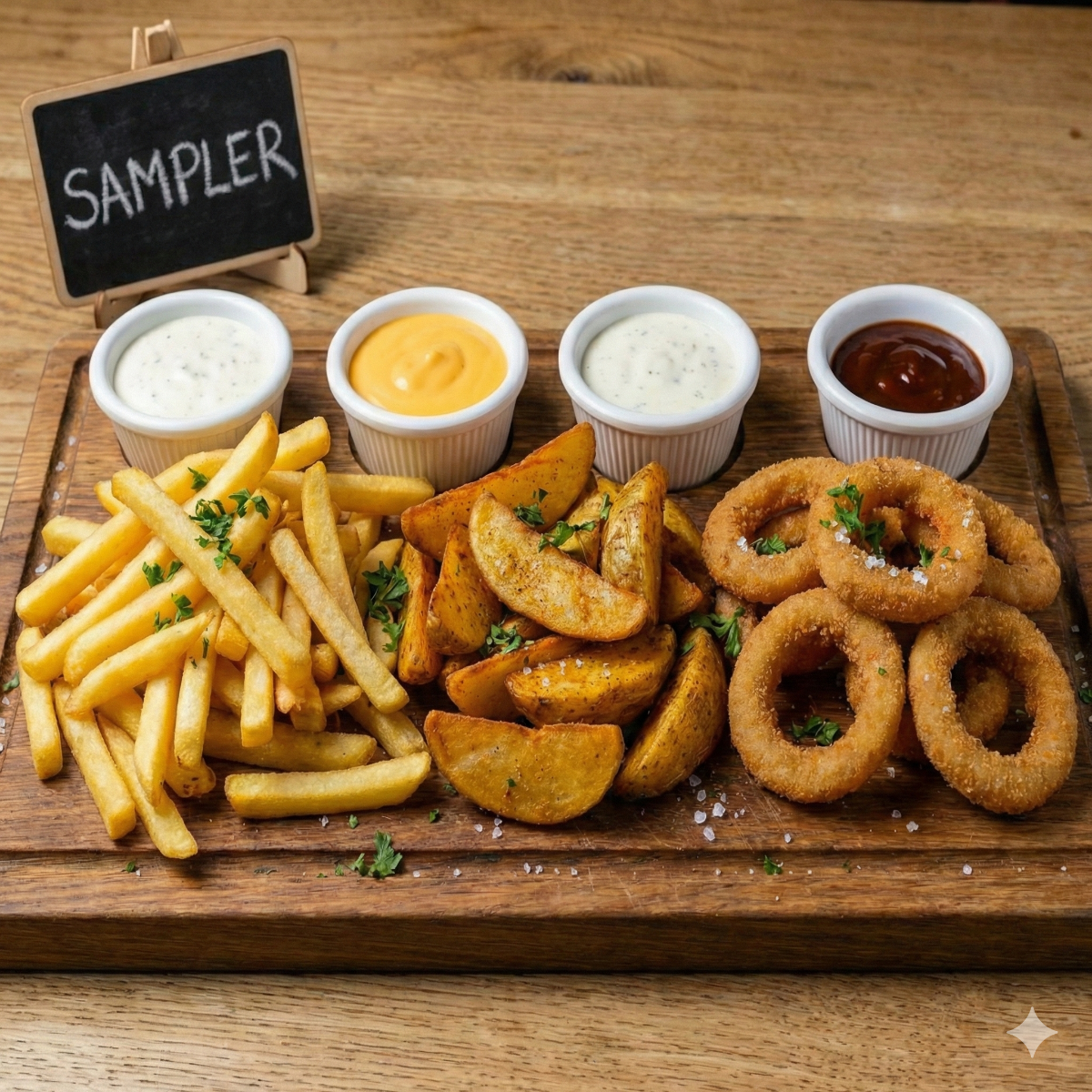 300 g De papa a la francesa, 150 g de papa en gajo y 150 g de aros de cebolla tradicionales, incluye 2 aderezo ranch, 1 aderezo de queso y 1 salsa BBQ.