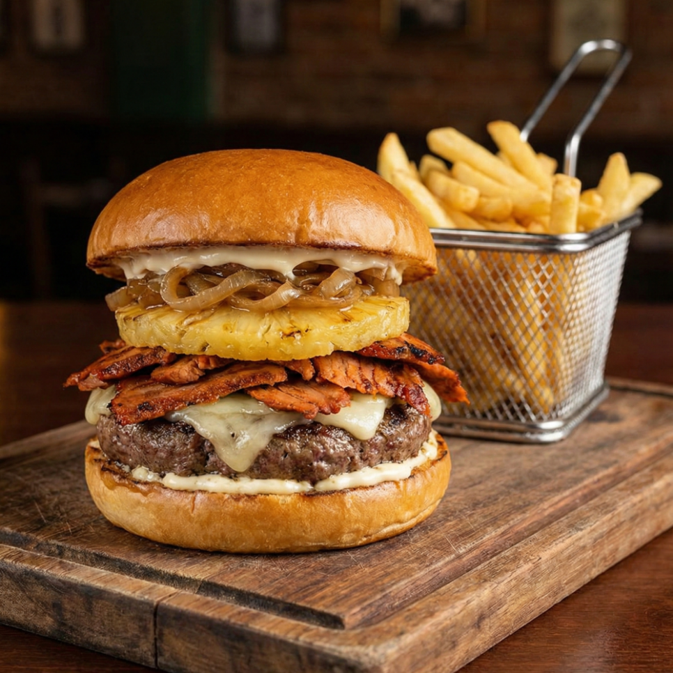 150 g De carne de hamburguesa, 150g de carne al pastor, piña al almíbar asada, cebolla asada, queso manchego, queso blanco y mayonesa. Incluye papas fritas.