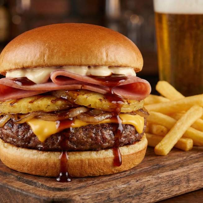 150 g De carne de hamburguesa, piña asada, cebolla asada a la parrilla, queso amarillo, jamón, mayonesa y salsa teriyaki. Incluye papas fritas.