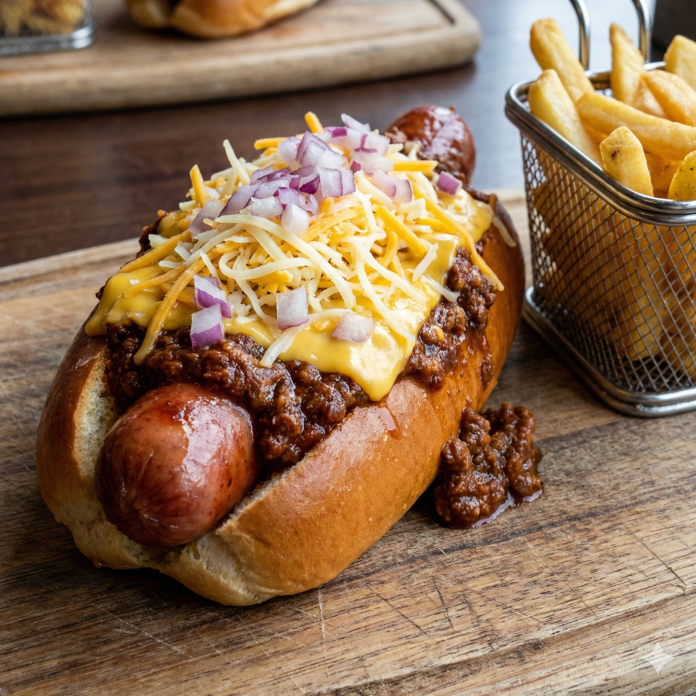 Salchicha jumbo con 100 g de chili de carne molida cocinada en salsa especial de la casa, queso americano, 3 tipos de queso y cebolla morada. Incluye papas fritas.