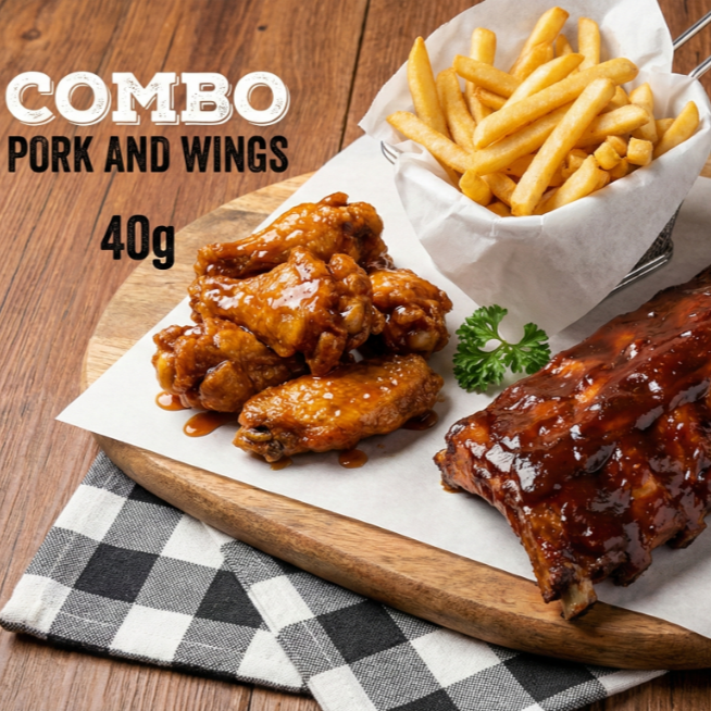 240 g De alitas normales en cualquiera de nuestras salsas, 1 orden de papas a la francesa, 300 g de costilla de puerco en salsa BBQ o salsa búfalo.