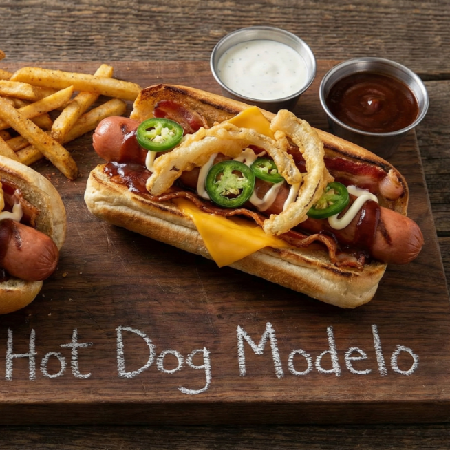 2 Piezas del hot dog modelo (salchicha jumbo de pavo, queso amarillo, tocino, salsa BBQ, mayonesa, jalapeño y trozos de cebolla tempura.